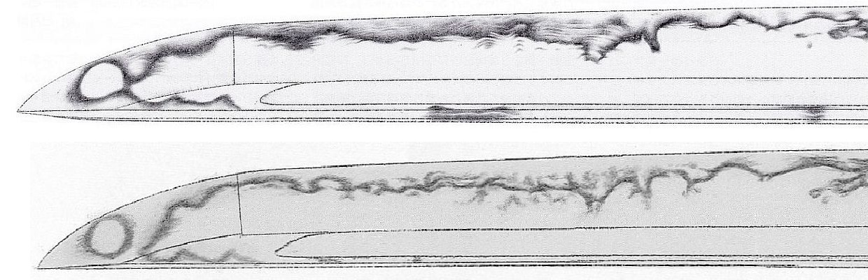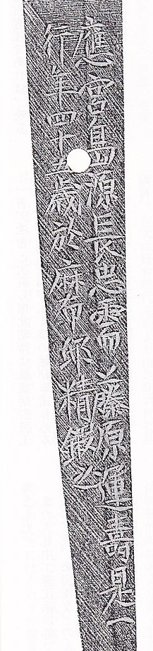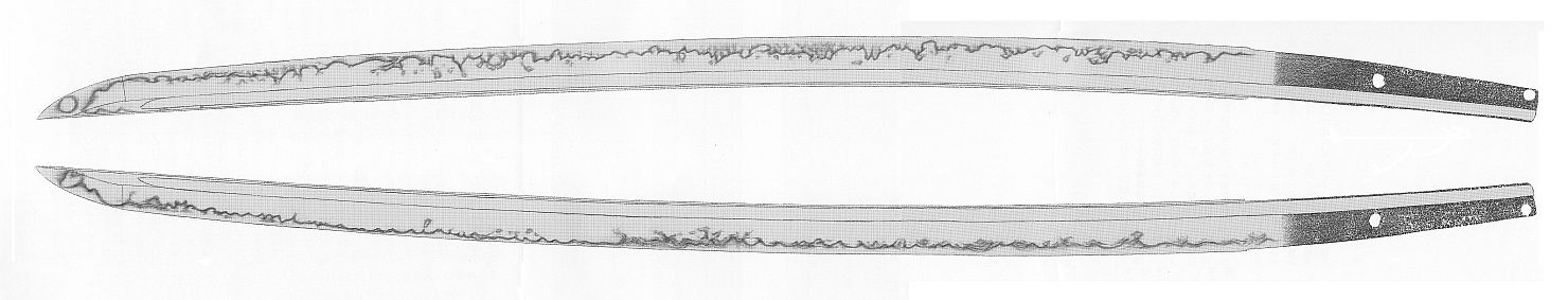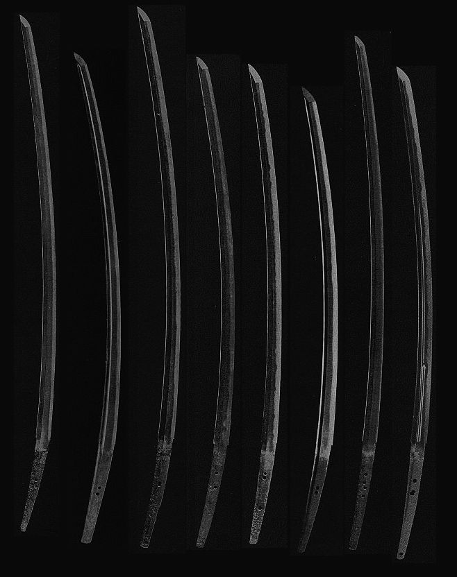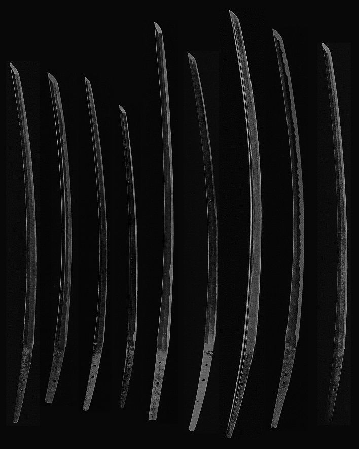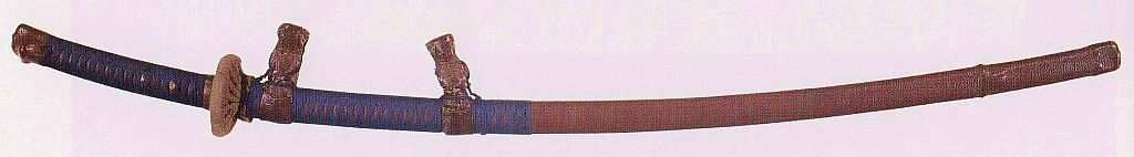 Picture 1: kokuhô „Kokindenju-Yukihira“, mei: „Bungo no Kuni Yukihira saku“ (豊後国行平作), nagasa 79,9 cm, sori 2,9 cm; below the koshirae to the blade which is said to go back to the time of Hosokawa Yûsai.