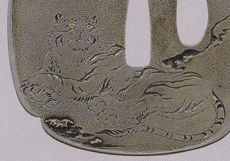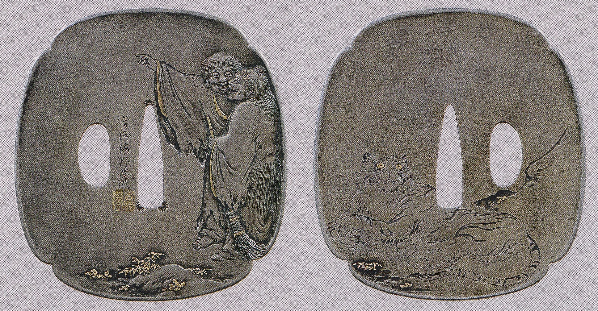 By way of an introduction, I would like to present one of my favourite tsuba (see picture 1). At this point I would also like to thank to owner for allowing me to study this fantastic work hands-on. The tsuba has jûyô papers, is of oborogin, depicts Kanzan (寒山), Jittoku (拾得) and a tiger, and is signed „Hôshû Unno Shômin“ + seal (芳洲海野勝珉). It has a slight tsuchime surface and Kanzan and Jittoku are represented by to the combined application of sukidashi-usunikubori and shishiai-bori. The gentle and rather sketchy tiger is done in katakiribori (see detail picture 2). It was made according to a special order of the Kôbe millionaire Ryûshidô Mitsumura Toshimo (龍獅堂光村利藻, 1877-1955) who had an especially profound appreciation of sword fittings. Shômin made it in Meiji 36 (1903), meeting his 60th birthday. It was made at a time when he was way out of the woods, having left behind the difficulties of the haitôrei, the Sword Abolishment Edict. In the eleventh and fourteenth year of Meiji (1878 and 1881), at the first and second „Exhibition for the Industrial Promotion of the Country“ (kokunai-kangyô-hakurankai, 国内勧業博覧会), he won prizes for his metalworks. And for the fourth exhibition held in Meiji 28 (1895), he was already appointed as a judge. Five years earlier, i.e. in 1890, Unno Shômin had entered the Tôkyô School of Fine Arts and studied there under Kanô Natsuo. One year later he became assistant professor and in November 1894 he was a regular professor. And in 1896, he finally became a teishitsu-gigei´in (帝室技芸員, lit. „Imperial craftsman“), the forerunner of the later ningen-kokuhô. To demonstrate the exciting but hard times back then for Japanese metal workers I would like to translate from the records of Mukai Katsuaki (向井勝明, also read „Shômei“), one of Shômin´s students.