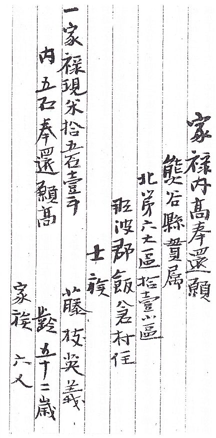 From the time the feudal han system was abolished until the new government was formed, the now unemployed samurai were in a kind of „vacuum“. To demonstrate this I want to introduce a document preserved in the Fujieda family (picture 1). In the seventh year of Meiji (1874), all samurai which had an income below of 100 koku were informed that the government grants them a lump sum in the amount of what they would have received in the subsequent six years. The mentioned document is Teruyoshi´s official declaration that he assigns 5 koku from his salary of 15 koku 1 to to the new Imperial government. Subsequently, he received from the government 187 Yen 62 sen 4 ri as well as government bonds in the amount of 75 Yen. This was the mentioned six-years lump sum payment and using the Consumer Price unit, 187 Yen would be today around 770.000 Yen or around $ 8.000, and the government bonds around % 3.000. However, it is unclear to what extant this was of help for the Fujieda family but in the Matsudaira records we find a lot of entries of people who ask for the permission to buy waste land or forests in the possession of the government to cultivate it and making so their new living before they run out of the lump sum. This too tells us in what difficult situation the ex-bushi were at that time. We also get a vivid picture of this situation from an extant document of Teruyoshi´s successor Torazô. In the 36th year of Meiji (1903) he asked for a government allowance to settle debts but he was informed two years later by the then Minister of Finance that his request was rejected.