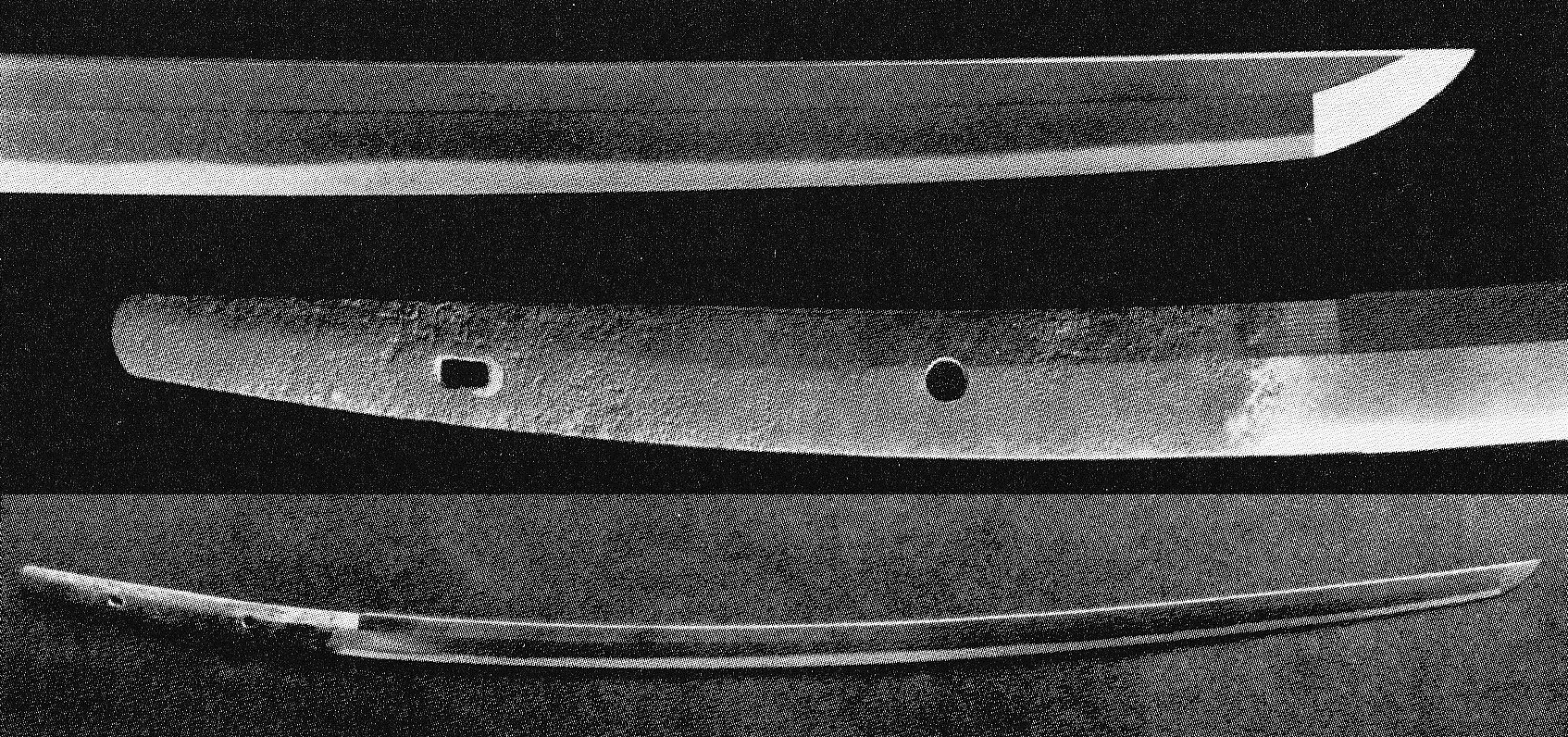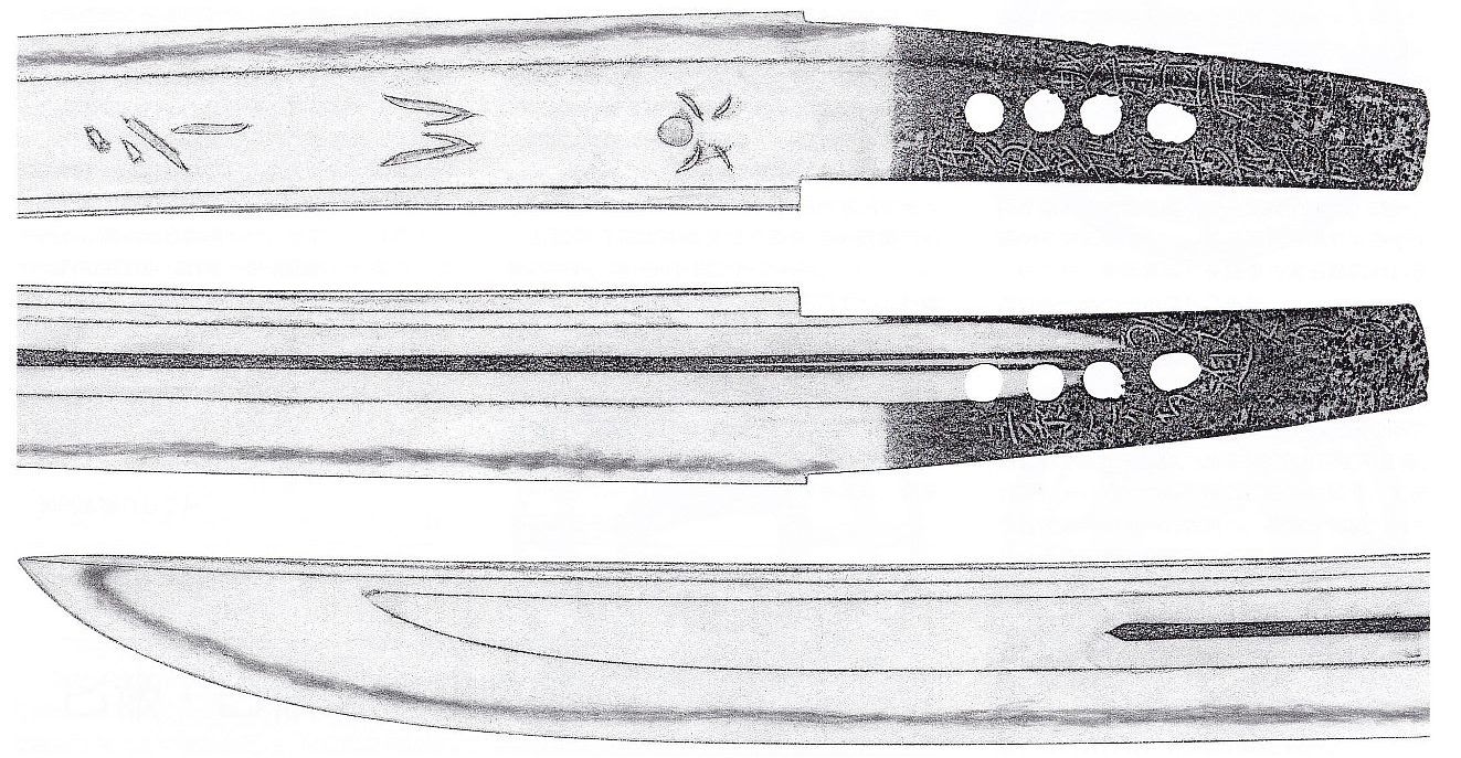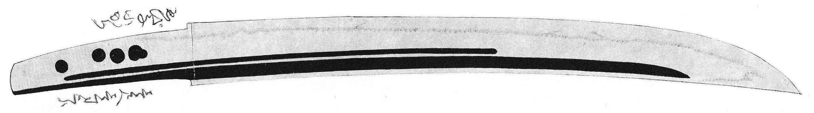 In Kaei six (嘉永, 1853), the fief ordered Teruyoshi to change his inherited profession from gunsmith to swordsmith. So probably the fief reacted appropriately as they had a promising smith in their ranks. But there is also another point of view on this changing of profession. On Teruyoshi´s tombstone we read: „He made on orders of his lord 200 nagamaki, katana and naginata each …“ This could suggest that his lord had him changed profession just for the porpose that he equips the fief with weapons in larger numbers. However, the Matsudaira chronicles do not deal with the exact reasons. Of course Teruyoshi made blades for the fief in larger numbers and there is a considerable number of specimen extant which proof this. The vast majority of them are naginata which are simply signed with „Bu Teruyoshi“ (武テルヨシ, in katakana syllables) or „Teruyoshi“ (英義) and showing for example the numbers 11, 19 or 31 engraved at the area of the habaki or a little below. In the „Hanshi-daijiten“ (藩史大辞典, an encyclopedia on the history of the fiefs) we read that the Kawagoe fief installed in the eleventh month of Kaei six arsenals on the coast at Kami-Shingashi (上新河岸) and Shimo-Shingashi (下新河岸) and that material and men were sent to guard the fort in Edo´s Takanawa (高輪). At that time, the Shingashi river was a main artery for transportations between the Kawagoe fief and Edo. In the sixth month of that year, Commodore Perry had landed at Uraga (浦賀) and so it is likely that Teruyoshi´s ordered change of profession was a measure of the trend to rearmament of those days.