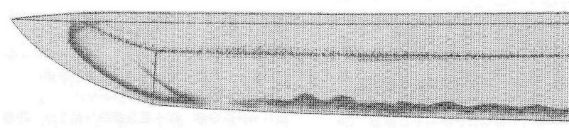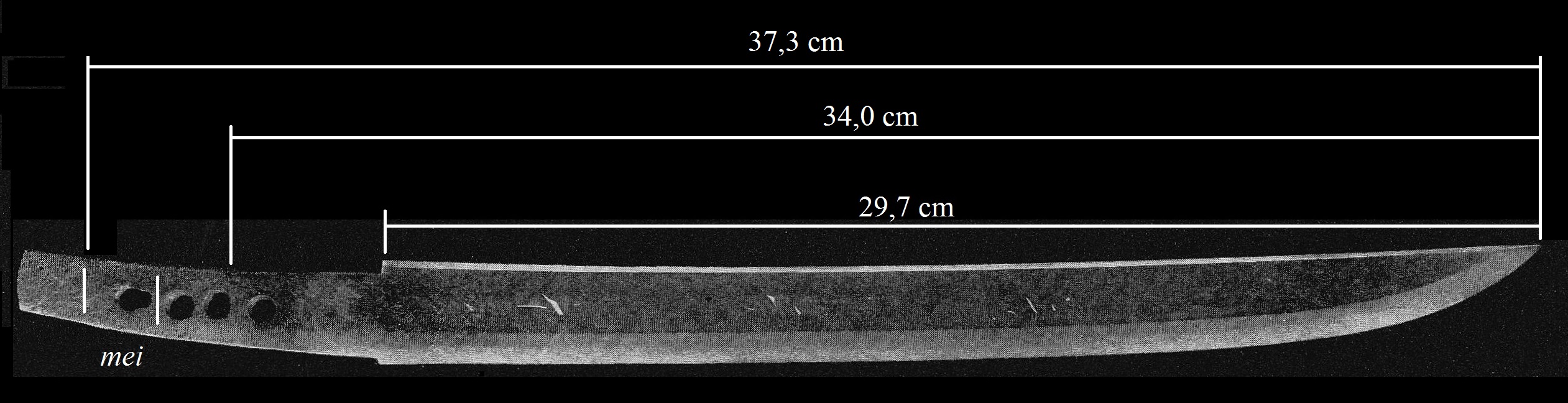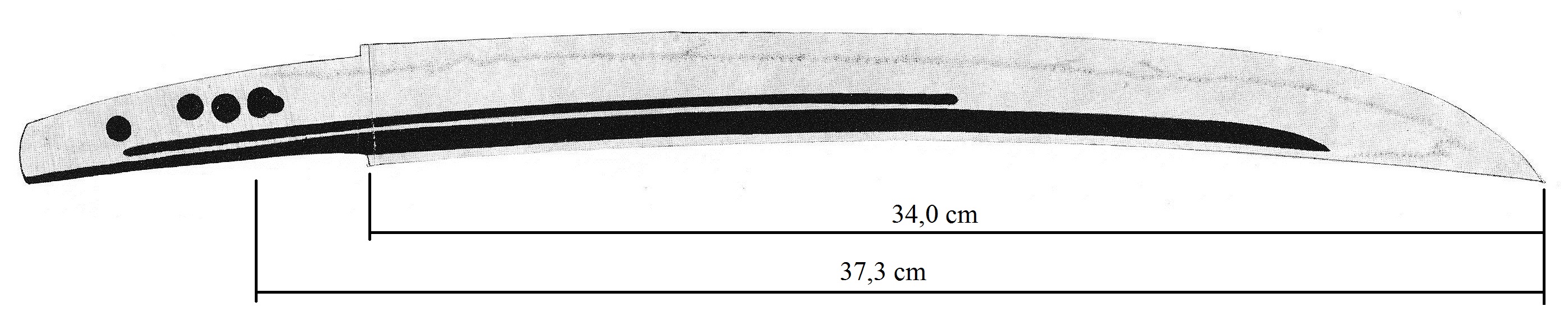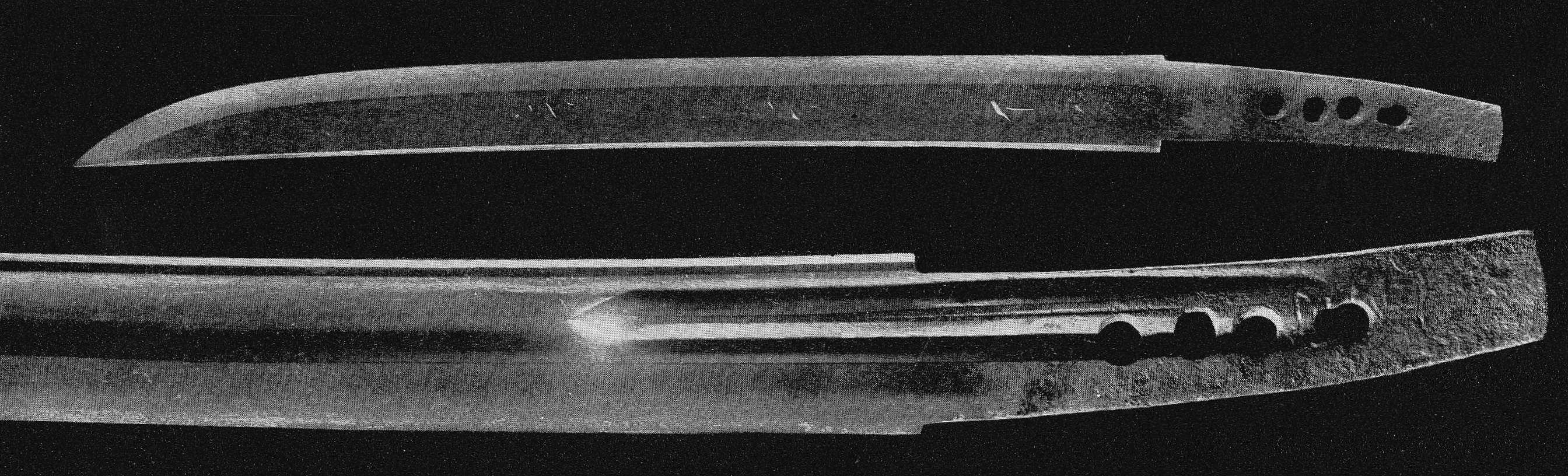 In Kaei six (嘉永, 1853), the fief ordered Teruyoshi to change his inherited profession from gunsmith to swordsmith. So probably the fief reacted appropriately as they had a promising smith in their ranks. But there is also another point of view on this changing of profession. On Teruyoshi´s tombstone we read: „He made on orders of his lord 200 nagamaki, katana and naginata each …“ This could suggest that his lord had him changed profession just for the porpose that he equips the fief with weapons in larger numbers. However, the Matsudaira chronicles do not deal with the exact reasons. Of course Teruyoshi made blades for the fief in larger numbers and there is a considerable number of specimen extant which proof this. The vast majority of them are naginata which are simply signed with „Bu Teruyoshi“ (武テルヨシ, in katakana syllables) or „Teruyoshi“ (英義) and showing for example the numbers 11, 19 or 31 engraved at the area of the habaki or a little below. In the „Hanshi-daijiten“ (藩史大辞典, an encyclopedia on the history of the fiefs) we read that the Kawagoe fief installed in the eleventh month of Kaei six arsenals on the coast at Kami-Shingashi (上新河岸) and Shimo-Shingashi (下新河岸) and that material and men were sent to guard the fort in Edo´s Takanawa (高輪). At that time, the Shingashi river was a main artery for transportations between the Kawagoe fief and Edo. In the sixth month of that year, Commodore Perry had landed at Uraga (浦賀) and so it is likely that Teruyoshi´s ordered change of profession was a measure of the trend to rearmament of those days.