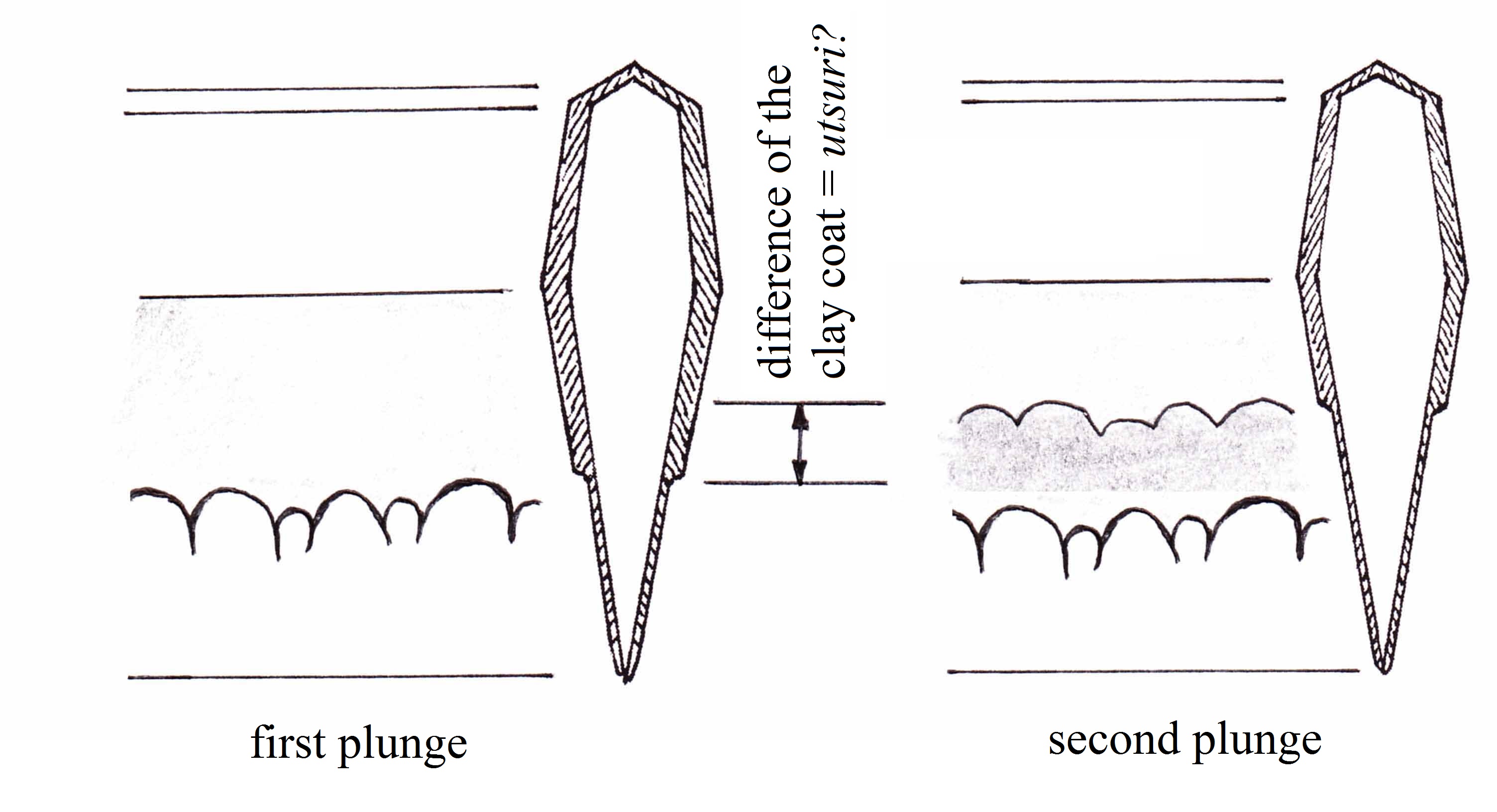 Another anecdote – which has surely nothing to do with the art of forging or metallurgy – is about how Kiyomaro was able to reproduce utsuri (映り). Utsuri (lit. „reflection“) is a more or less visible temper effect on a blade which appears above the hamon and which can reach the shinogi ridge (or even go beyond it). Not every blade shows utsuri and first and foremost it was a characteristic feature of Bizen blades from the Kamakura to the early Muromachi period. Successive smiths of the shintō era (新刀), i.e. from the Edo period onwards, had serious problems reproducing utsuri and the „secret technique“ had almost fallen into oblivion by the time of Kiyomaro. He went to great lengths, day and night, but without success. So he asked Sugane: „Master, I need your advice again. How am I able to reproduce utsuri?“ He told him of all the attempts he had tried so far until Sugane interrupted him: „That is actually the problem. You want it too much. Forge your blades without forging in mind, like the old Bizen masters did. Then you will be able to reproduce utsuri.“ And the anecdote says that his mentor was right and soon he was able to apply a controlled utsuri.