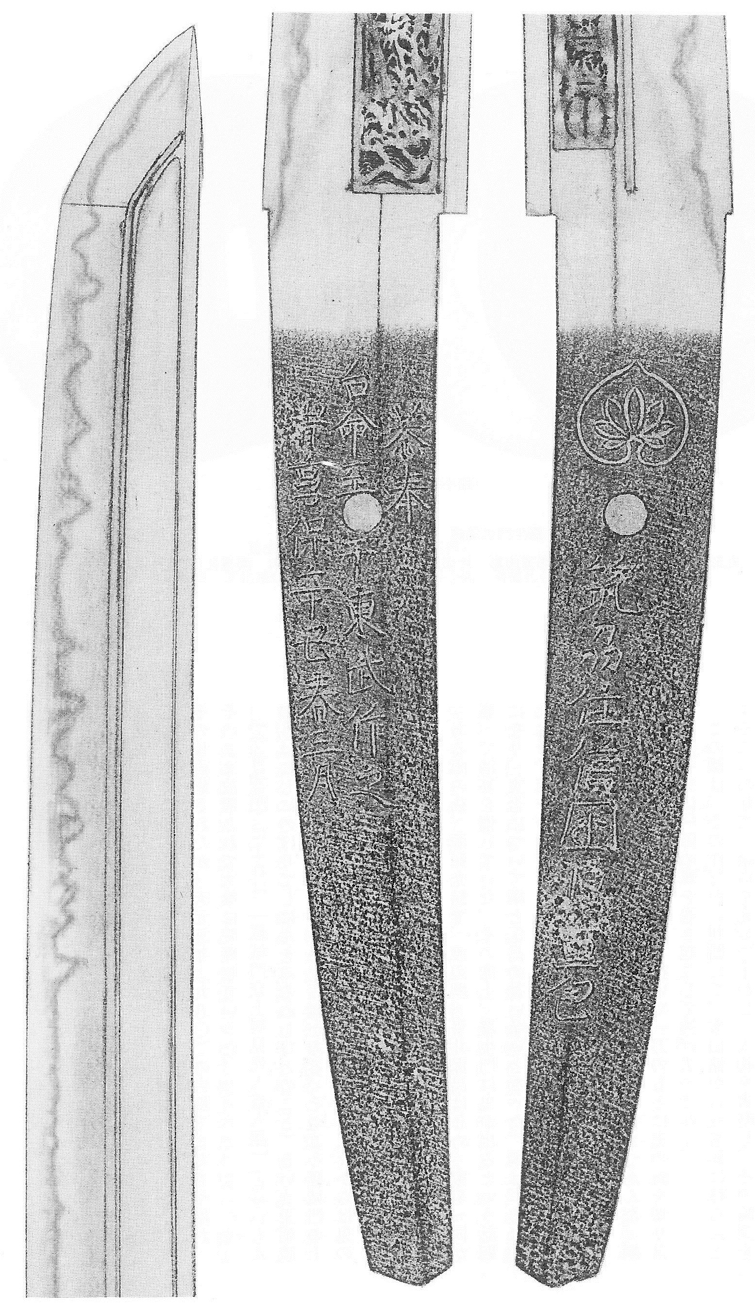 Tadatsugu got this tachi from Ieyasu for his military achievements in the Battle of Komaki and Nagakute. It also comes in an itomaki-tachi-koshirae with a kin-nashiji lacquer saya and en suite fittings with the aoi and kiri crest made by the Shônai-kinkô Yûrakusai Sekibun (遊洛斎赤文), that means the mounting dates to the Edo period. The blade has a nagasa of 76,6 cm, a sori of 2,4 cm and a motohaba of 2,7 cm. It is in shinogi-zukuri, has an iori-mune, a deep koshizori, funbari and a ko-kissaki, and so its sugata dates it clearly to the early Kamakura period. The kitae is a somewhat standing-out ko-itame mixed with ko-mokume. There is ji-nie and a faint midare-utsuri and the hamon is a quite nie-loaden mix of ko-chôji and ko-midare with nijûba and kinsuji whereat the yakihaba gets wider towards the tip. The bôshi is a wide yakitsume with hakikake and appears almost as ichimai. The tang is ubu, has a kijimomo-gata, shallow katte-sagari yasurime, a shallow kurijiri and bears the sanji-mei „Nobufusa saku“ (信房作). It is interesting that there were two more swords of Nobufusa in the possession of the Sakai family. The one is a rather small tachi with the sanji-mei „Nobufusa saku“ which belonged to the Sakai branch which ruled from the mid Edo period onwards the Himeji fief (姫路藩) of Harima province. And the other one was a tachi signed in the very same way which belonged to the Sakai branch which ruled the Obama fief (小浜藩) of Wakasa province.