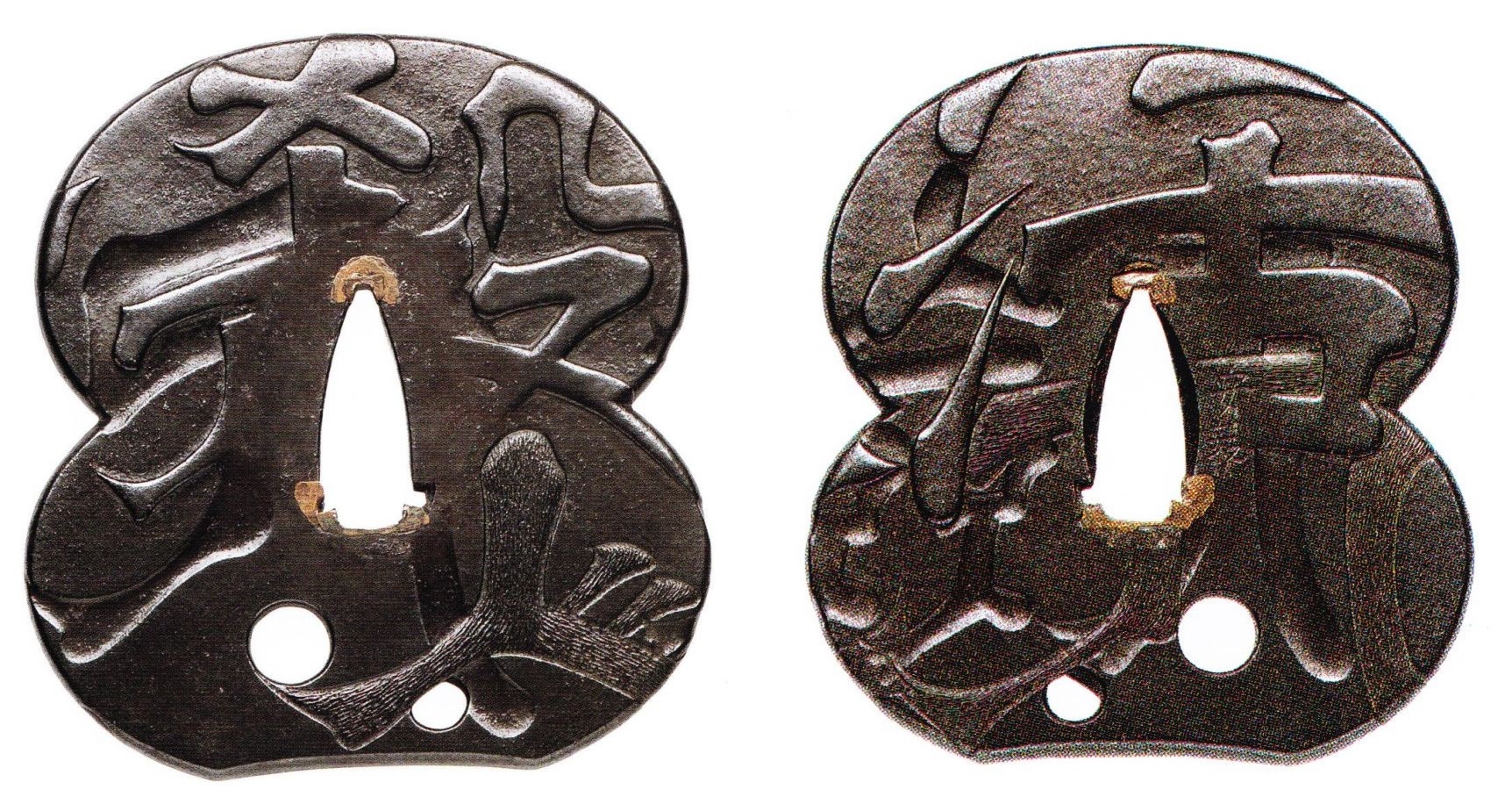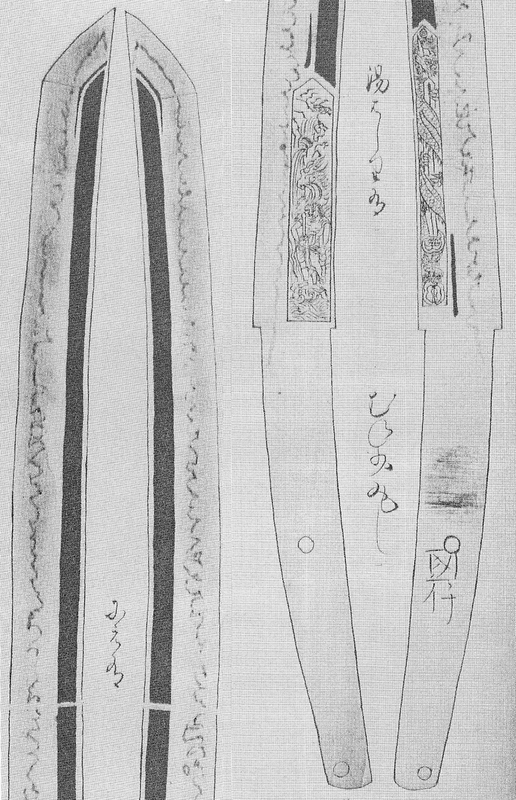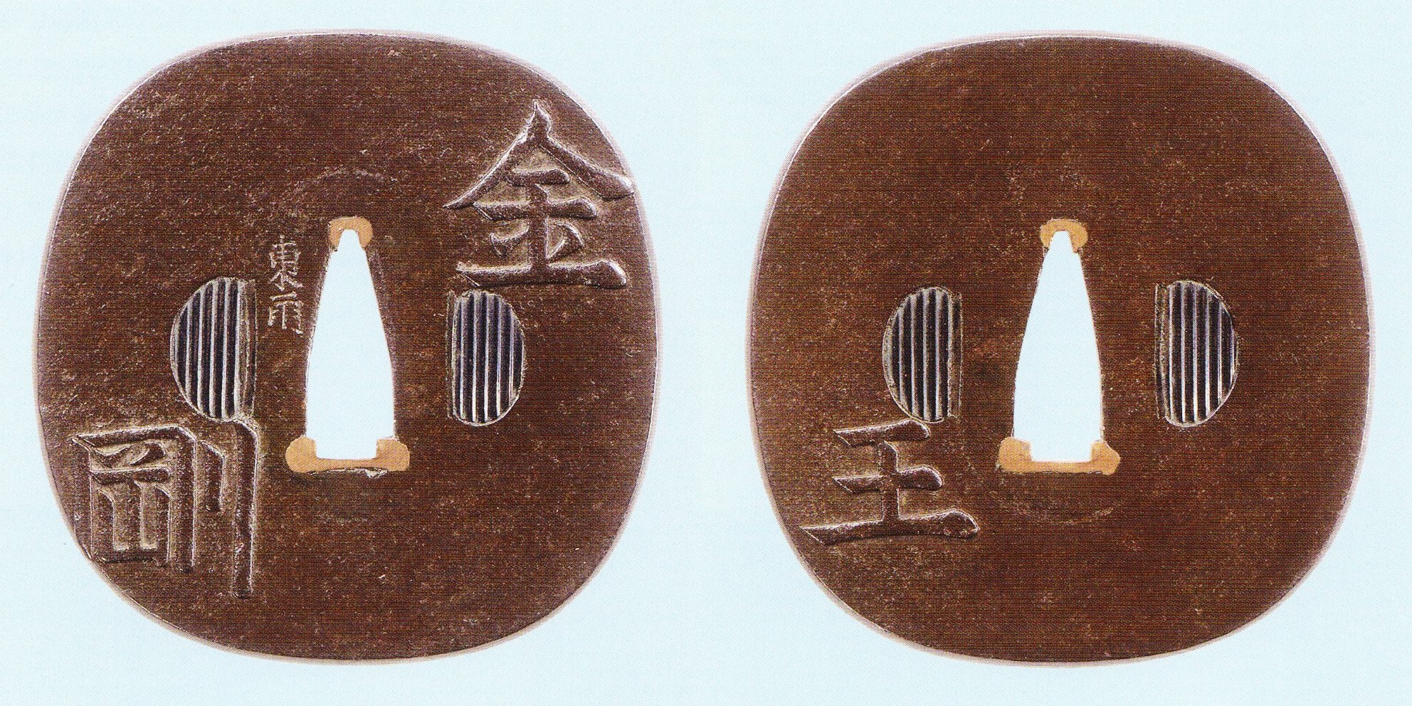 This tachi was in the possession of the Shônai-Sakai family since the Edo period. It has a nagasa of 70,9 cm, a sori of 2,1 cm and a motohaba of 2,9 cm. The blade is also featured in my latest publication Kantei Supplement 2. With the extant signature at the very end of the tang, we can calculate an original nagasa of about 83 cm. The kitae is a dense and beautifully forged itame with nagare towards the ha. Especially the haki-omote side shows many areas of a very densely forged hada. In addition, there is plentiful of ji-nie and chikei. The hamon is a rather low and slightly undulating notare-chō to suguha with hotsure, uchinoke, kuichigaiba, nijūba, yubashiri, sunagashi and kinsuji. The nioiguchi is wide, bright, clear and very nie-loaden, and the yakiba gets somewhat wider in the monouchi area. The bôshi shows much hakikake, tends to kaen, and runs out as yakitsume. Incidentally, the futasuji-hi are untypical for Kanenaga but the accompanying documents to the blade show us that they were once added in Kansei eight (寛政, 1796) by the Hon´ami family, namely on orders of the Sakai family.
