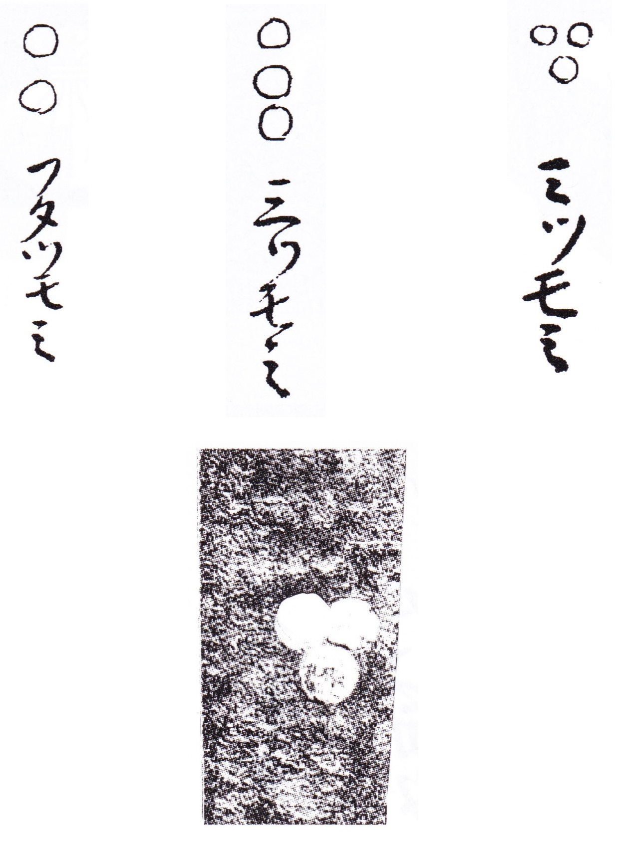 The first three pictures describe an arrangement of two or three peg holes one below the other or in a triangle. These arrangements are called „futatsu-momi (フタツモミ) and „mitsu-momi“ (ミツモミ) respectively what might best be translated as „twosome rubbing“ and „threesome rubbing“. The text mentions that in this category, just the number is counted and that four aligned menuki are called „yotsu-momi“ (ヨツモミ) and five „itsutsu-momi“ (イツツモミ) and so on. A mitsu-momi in a triangular arrangement is very rare and is mostly restricted to early kotô blades like the one shown below from a tachi of Bungo Yukihira (行平).
