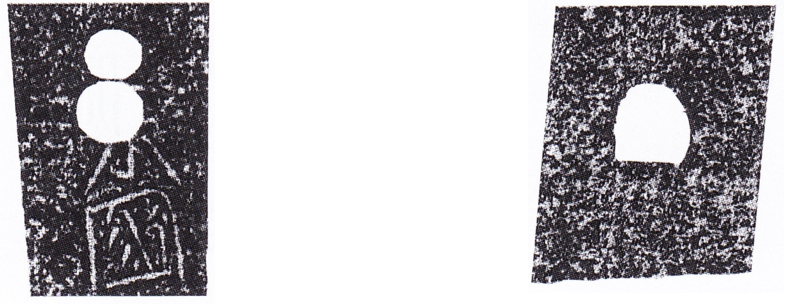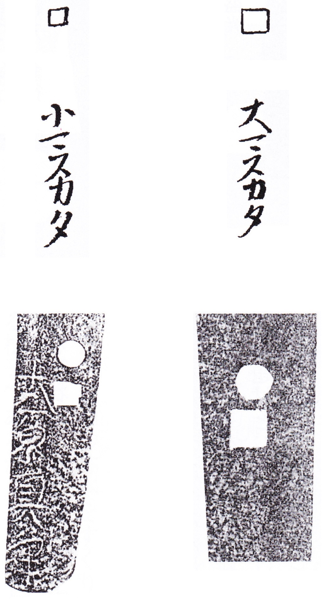 Number eleven and twelve are called „ko-masugata“ (小マスカタ) and „ô-masugata“ (大マスカタ) respectively, i.e. small (ko, 小) and large (ô, 大) square masugata, 枡形). However, it is unclear how it was actually distinguished between „small“ and „large“. Kondô suggests that if the edge of a square mekugi-ana corresponda approximately to the diameter of an average mekugi-ana, it might be called as ko-masugata. If the edge is larger, probably the classification ô-masugata applies. To substantiate this approach, we see at the lower left a tachi of Ôhara Sanemori (大原真守) where the square hole has about the same size as the regular mekugi-ana. At the Taima-tantô (当麻) to the right, the square hole is a hint larger as the regular mekugi-ana. By the way, such a hole is quite archaic and goes back to times when menuki and mekugi formed a unit and where the square hole hindred the ornament from twisting.