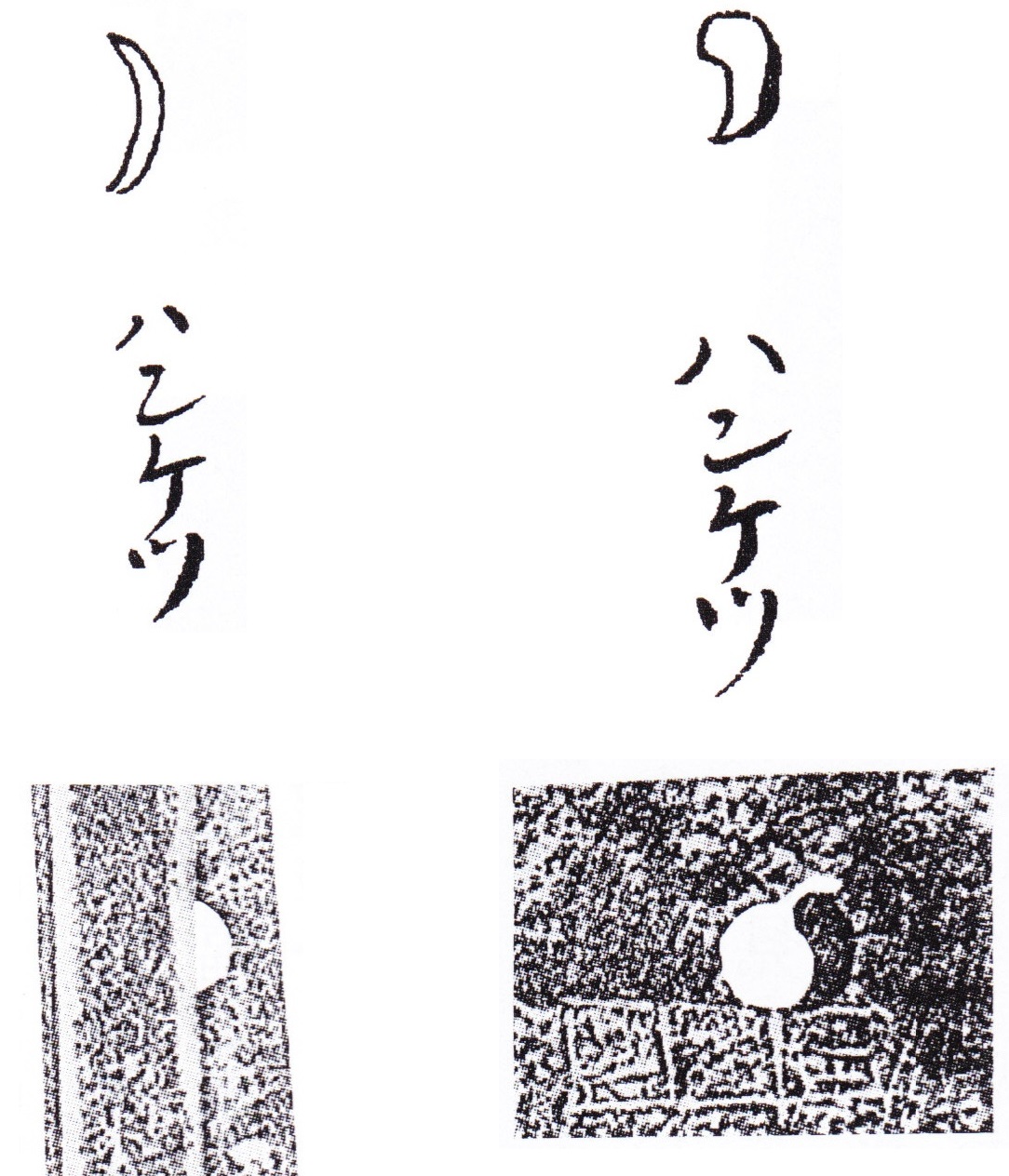 The last two depictions of the chapter „Menuki-ana no shidai“ are both called „hangetsu“ (ハンケツ, „half-moon“) whereas the the last one to the right reminds more of a comma-shaped bead (magatama, 勾玉) oder of a tomoe (巴). And the former one seems to be exaggerated as it is hardly possible to stick a mekugi through such an opening. So maybe the last two examples actually don´t show mekugi-ana but shapes which occur through an orikaeshi-mei or gaku-mei (see picture at the lower left on a katana of Kunimune, 国宗), or a semegane softmetal fitting (see picture at the lower right on a katana of Sukesada, 祐定). In this sense it is possible, that the katakana syllables „hanketsu“ actually stand for (半欠) what means „half missing“.