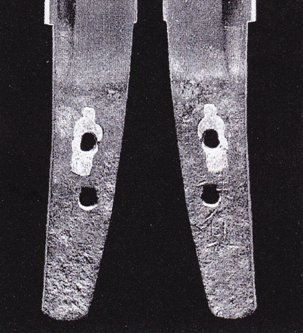 All those mekugi-ana go back to the necessity of adding a new peg hole or to enlarge or adjust an existing one. That means except maybe number nine with the cross-shape, we are probably not dealing with holes which were consciously opened in suhama or inome shape and the like. In other words, the publication just gathered existing mekugi-ana and gave them names. In earlier times, smiths or other craftsmen were not exactly gentle when it came to adding new holes as they were drilled through signatures and dates without remorse. Today this seems like „wanton destruction“ of important references but back then a new peg hole just marked a new phase in the life of a blade as the owner was at the best a „custodian“ who took the sword temporarily from his predecessor and had to give it away at the end of his life.