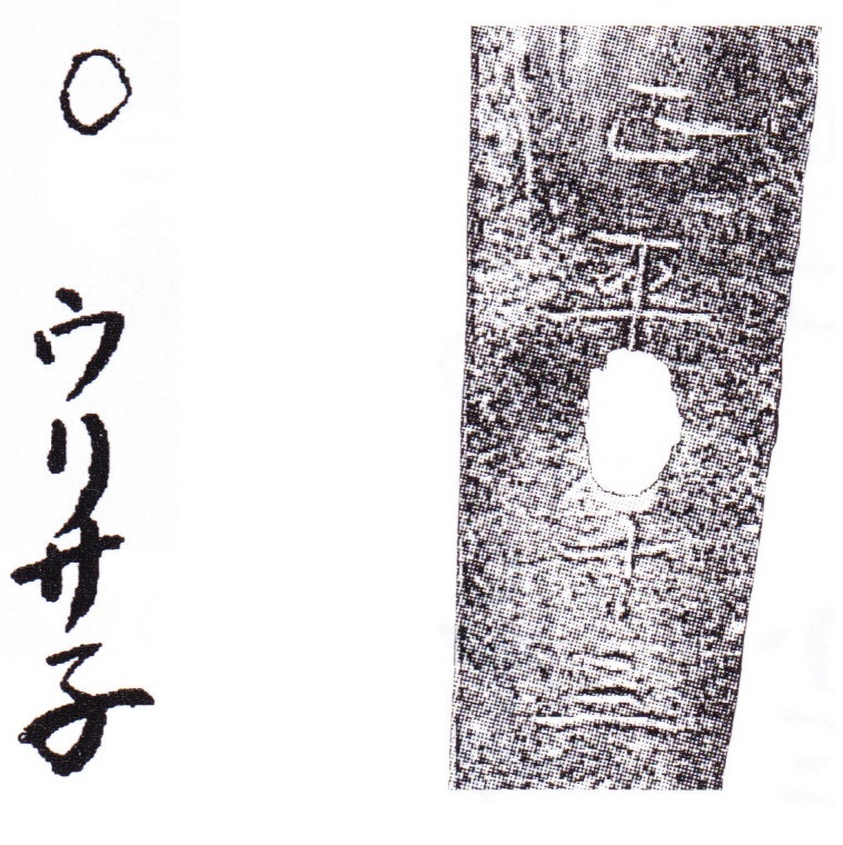 The fourth picture is called „urizane“ (ウリサ子, lit. „melon seed“). So here not the arrangement but the shape of the mekug-ana is described. Such a hole is very common and comes by widening an existing mekugi-ana. The picture to the left shows an actual example on a tantô of Tomoyuki (友行).