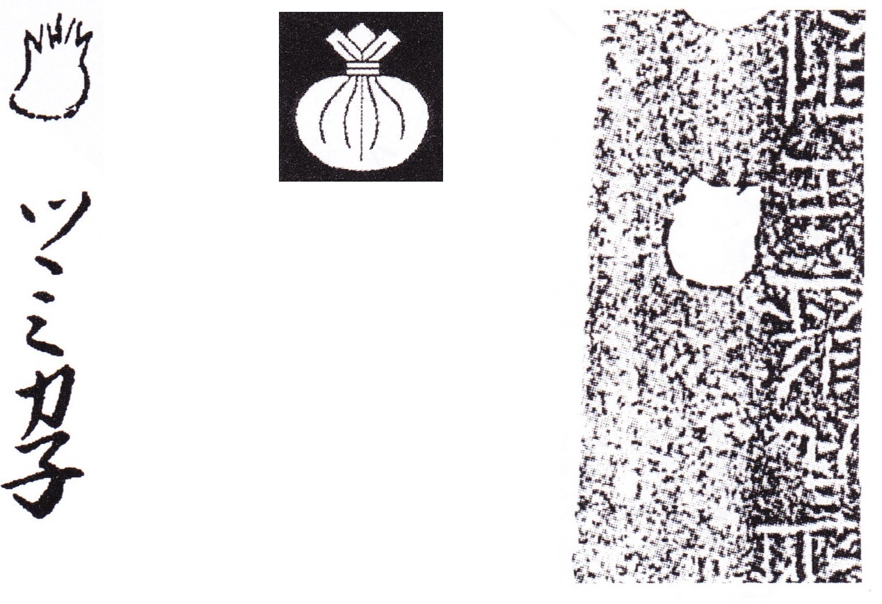 Number six is called „tsutsumigane“ (ツゝミカ子) what refers to the shape of a wrapped-up money present (tsutsumigane, 包み金) or the auspicious symbolism of a bag of gold (kanabukoro, 金袋, see b/w picture in the middle). Principally a tsutsumigame describes a hole which was once widened and where the mekugi got loose again. To tighten the peg, the steel was hammered from one side to narrow the hole again, namely to avoid opening a new mekugi-ana. The picture to the right shows an actual tsutsumigane hole on a tachi of Shikkake Norinaga (尻懸則長).