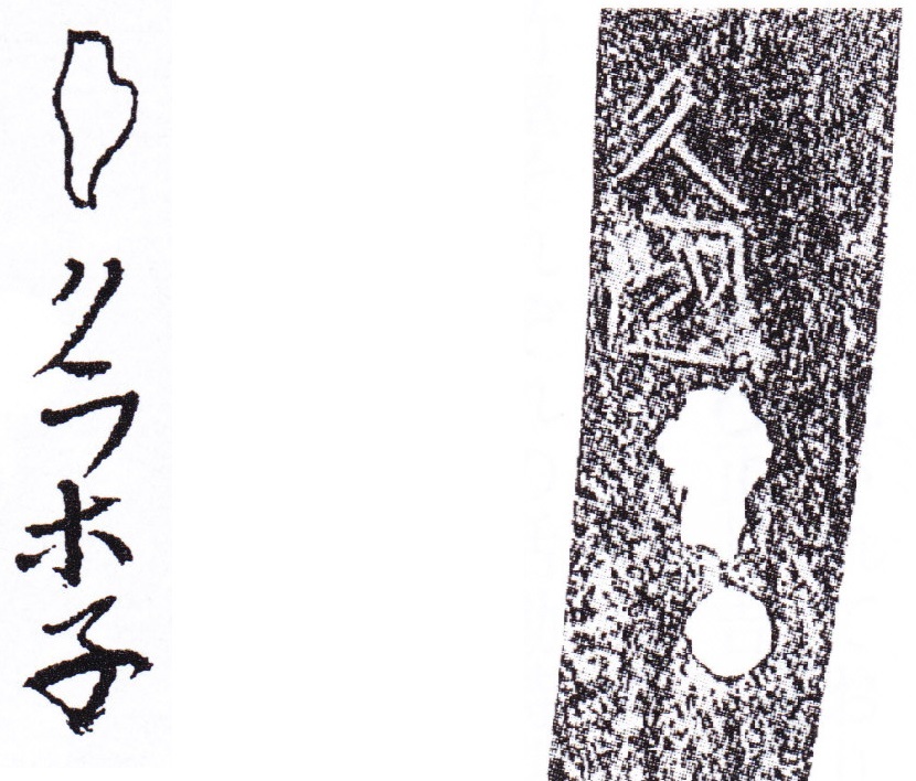 The seventh picture bears the name „kurahone“ (クラホ子), i.e. the frame (hone, 骨) of a wooden saddle (kura, 鞍). It is hard to find actual examples of mekugi-ana which match this depiction but probably one like seen on the tachi of Hisakuni (久国) on the right is meant.