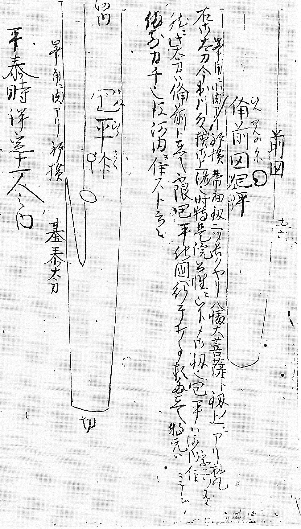 秦包平、同御宇、永延以来 河内国住人或備前住秦ノ字ヲハ不打ト云柄 身サキ細也切ヤスリ峯モハ方モメンヲトル柄身先 少丸シ銘太刀ハ目貫穴ヨリ上ニ打刀ハ下ニ打 保昌懐太刀造之後ニ鳥羽院之御剣釜歯 ト号、其右将相伝之常ニ狩場ヘ出御之時 被入御簾之間之号ニ簾丸又最明寺殿被写 置作者藤兵衛國吉也、是太刀ヲハ懐剣ト号 セラル、包平作懐太刀也、國吉作ヲハ懐剣と号ス