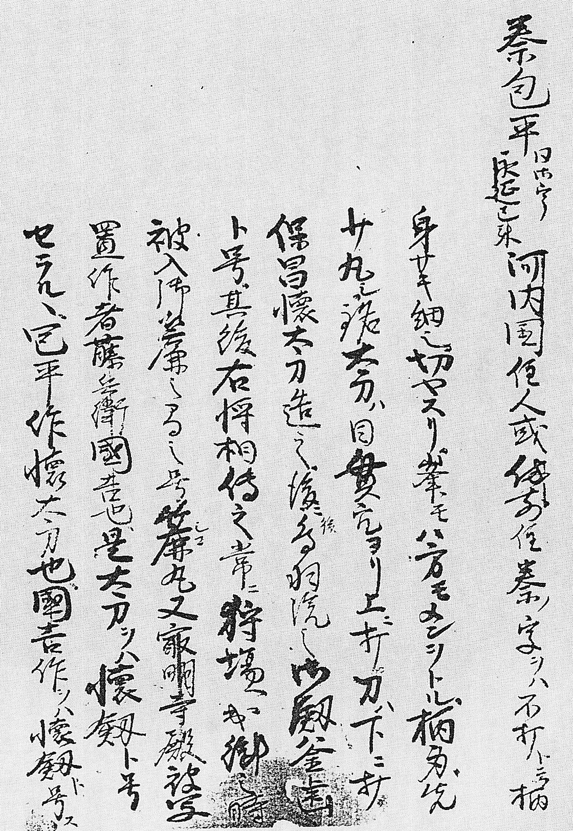 泰兼平 河内國住人、ほうしやうのふところ太刀を作、 後には後鳥羽院の御つるぎかまのは きりとがうせられ、又うたいしやうけの 御時つねにかりはゑ御出之時、御箱に 入るる間、箱丸とがうす、其後、さいみやうじ どのの御時うつしおかれ、ふところのつるぎど がうす、ころれはとうひょうえのぜぶ國吉 がさく也、ふところ太刀、ふところつるぎ かくへちなり。