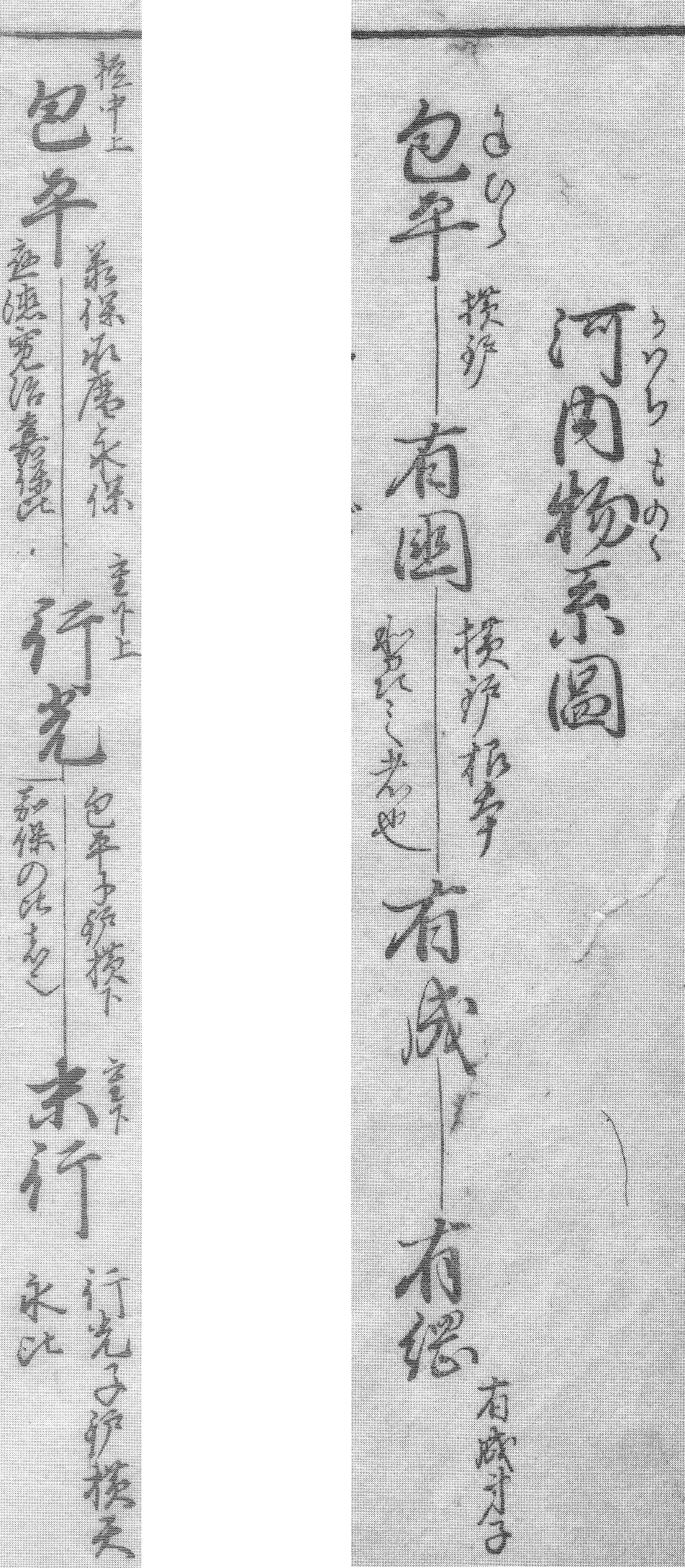 Picture 4: The genealogic entries from the first volume of the Kokon-mei-zukushi. Left the Ko-Bizen entry, right the Kawachi entry.