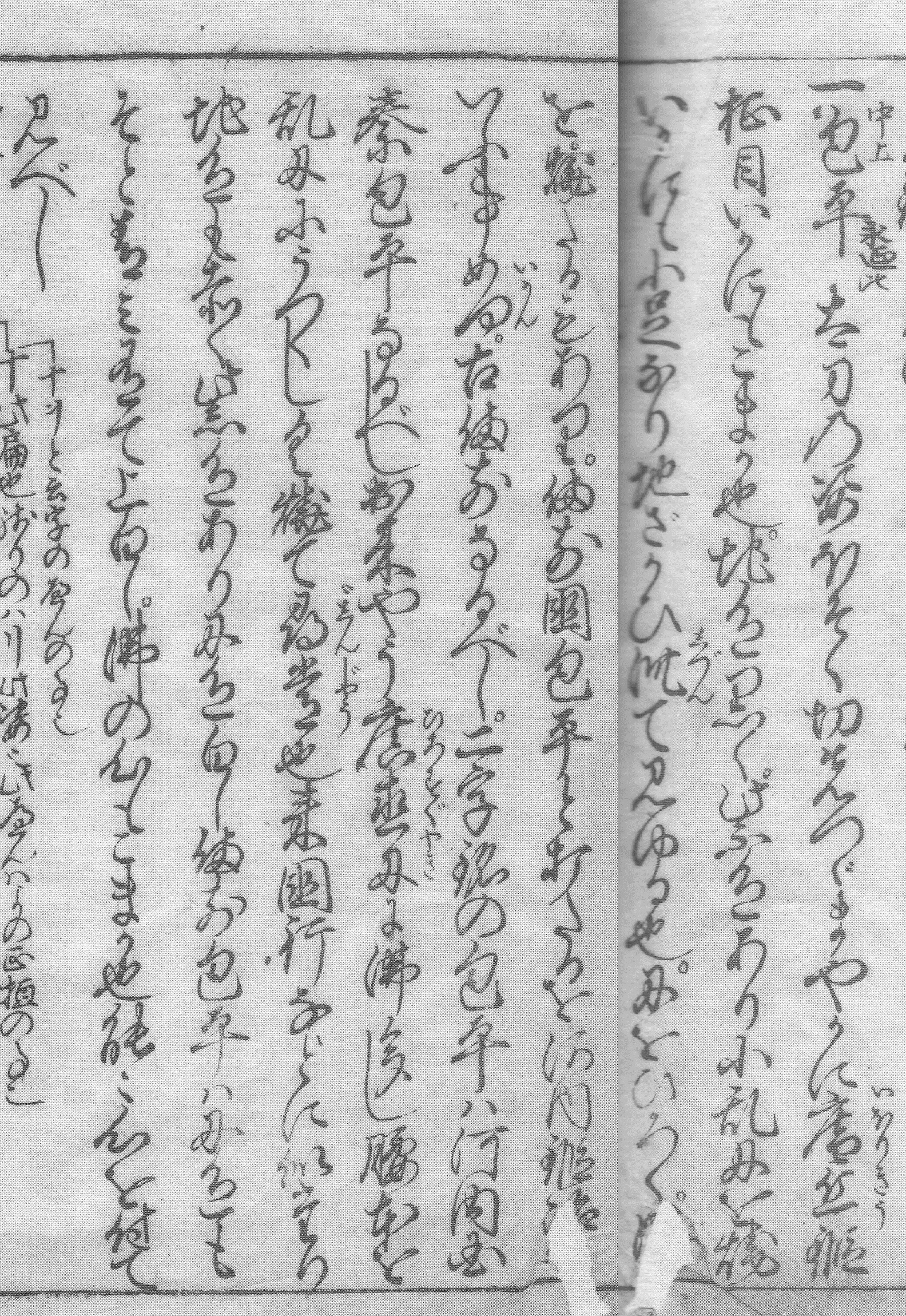 一、包平 永延比 太刀の姿ほそく切先つゞまやかに庵丘鍛 柾目いかにもこまか也。地色黒く。紫色あり。小乱刄を焼 いかにま小足なり。地ざかひ沈て見ゆる也。刄をひろく、沸 を焼たるもあり。備前國包平と打たるを河内鍛冶と いふ事如何。古備前なるべし。二字銘の包平は河内國 秦包平なるべし。出来やう廣直刄に沸多し。腰本を 乱刄にうつくしく焼て尋常也。来國行などに似たり。 地色も赤く紫色あり。刄色白し、備前包平は刄色も そと青み有て上白し。沸の心もこまか也。能々心を付て 見べし