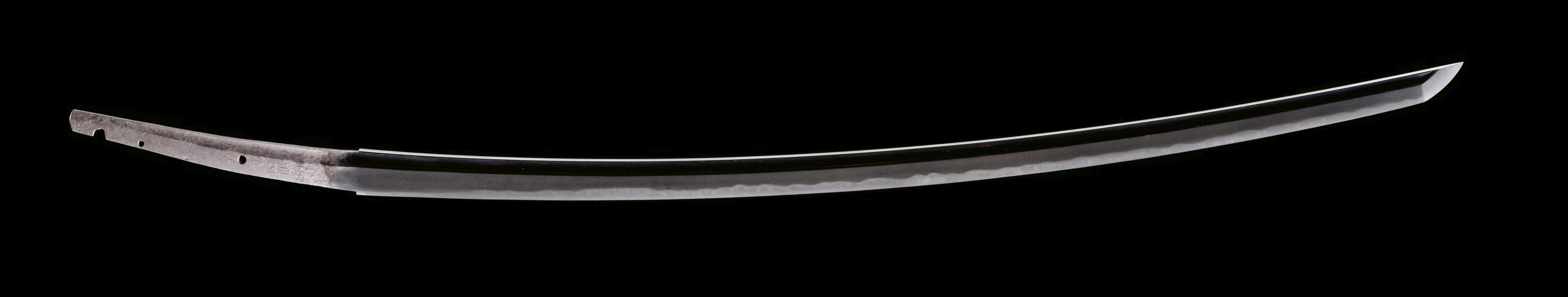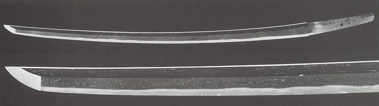 The blade has a kaku-mune with ko-niku, kiri-yasurime, shows two long (su)ken on the haki-omote and bonji over the characters of Hachiman-Daibosatsu and another (su)ken on the ura side. When lord Jizei´in (持是院), i.e. Saitô Myôjun (斎藤妙純, ?-1497), proceeded to Kyôto, he was presented with this sword by the noble Imadegawa family (今出川). Then it is stated that Kanehira lived in Kawachi province but that this tachi was made when he was in Bizen and that the smith worked also in other regions. And finally it is written that Kanehira was originally a Bizen smith and that he moved later in his career to Kawachi.