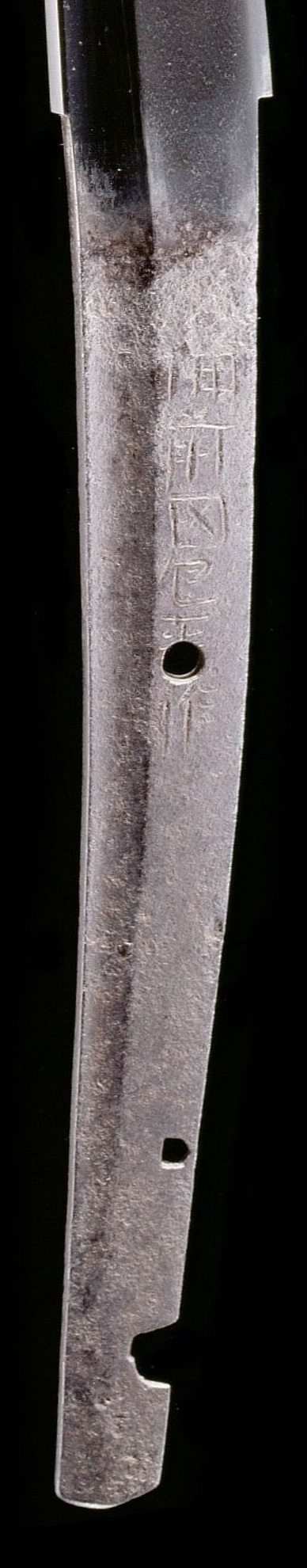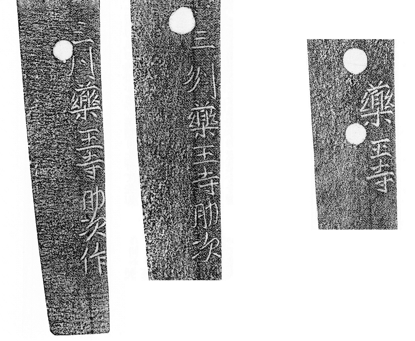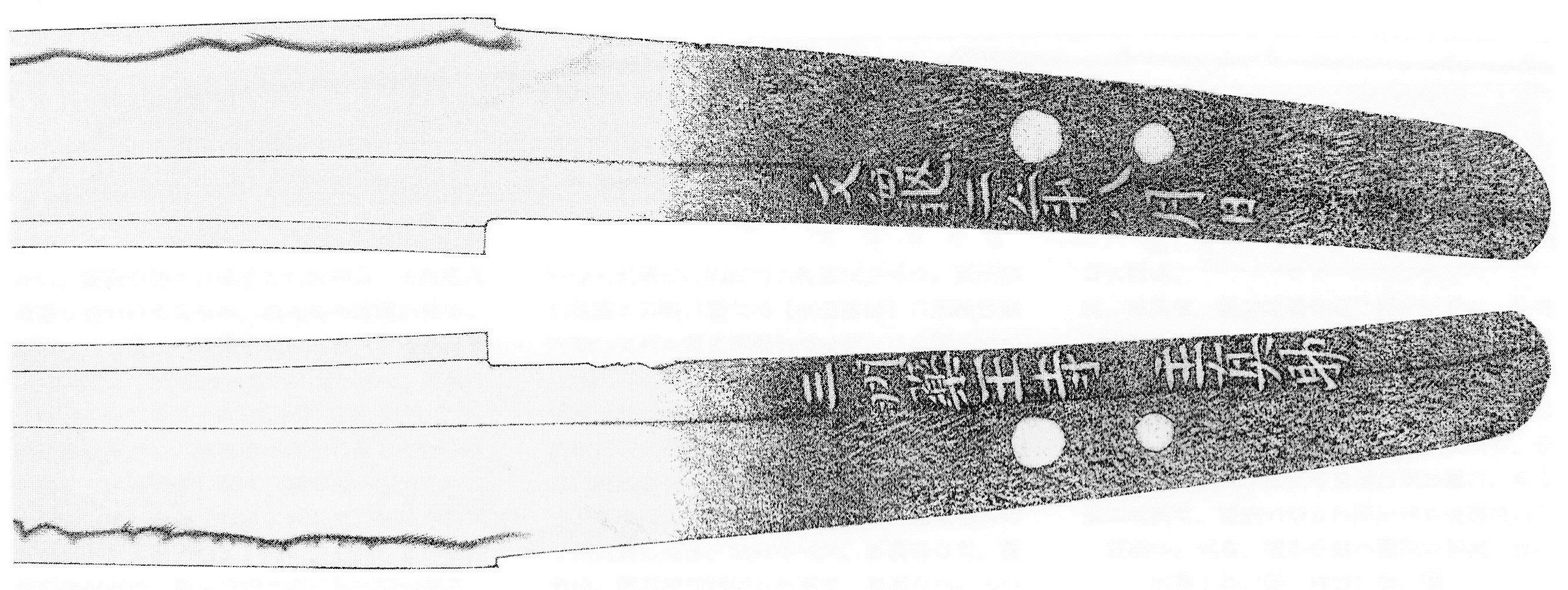 Hata Kanehira, active during the reign of emperor Ichijô (一条天皇, 980-1011, r. 986-1011) and from Ei´en onwards. Note that the entry states dô-gyo´u (同御宇), lit. “same reign”, which refers to the previous entry. Then we read that he was a resident of Kawachi and of Bizen but that he did not sign with “Hata” when in Bizen province. His tangs taper from both the mune and ha side, show kiri-yasurime, and a somewhat roundish nakago-jiri. Tachi are signed above the mekugi-ana and katana below of the mekugi-ana, whereat katana refers here probably to koshigatana or similar smaller sized blades. One blade was the beloved sword of Fujiwara no Yasumasa with came then in the possession of the abdicated emperor Toba who nicknamed it “Kama no ha”. Then the same legend with Minamoto no Yoritomo follows but with the difference that the sword was stored away behind a bamboo screen (misu) and was thus caled “Misu-maru” (簾丸). And later on, Hôjô Tokiyori had Awataguchi Kuniyoshi make a copy of the sword which was called futokoro-ken and the original of Kanehira futokoro-tachi. So without a few exceptions, the Genki-gannen tôken-mekiki-sho follows faithfully the Kanchi´in-bon mei-zukushi.