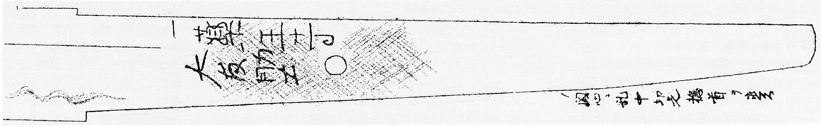 Now lets tackle the next reference, the Ôseki-shô (往昔抄) from Eishô 16 (永正, 1519). The entry therein is insofar precious because it comes with a drawing of a nakago which is signed “Buzen no Kuni Kanehira” (備前国包平). Please note that the character for “Kuni” is not just abbreviated in this drawing because Kanehira actually signed that way, seen in the picture to the right which is the mei of the Ô-Kanehira. So the Ôseki-shô writes next to the tang: