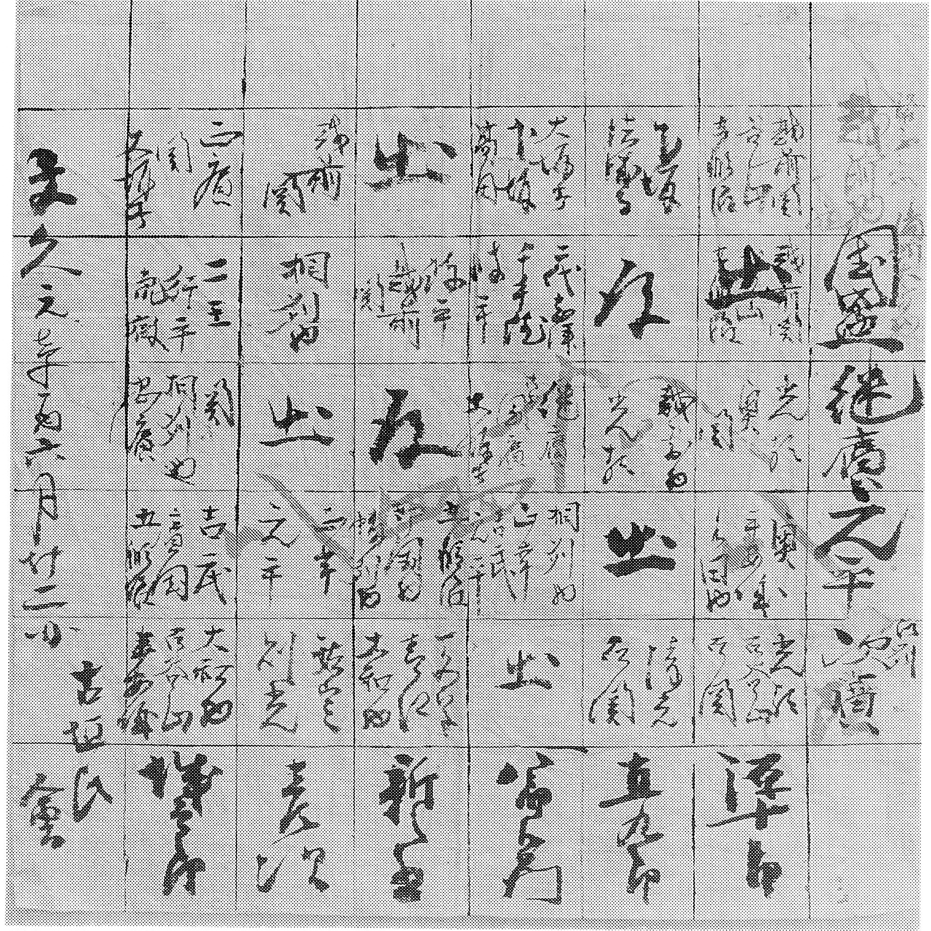 Next, let us take a look at the kakikudashi-mei by smiths outside of Bitchû, Bizen, Yamashiro, and Yamato. The four from Chikuzen are all found on blades by Jitsu’a (実阿). Accoding to tradition, Jitsu’a was the son of Sairen (西蓮) and the last of the Chikuzen masters who worked in the traditional and classical Ko-Kyûshû style which has as we know much in common with the Yamato tradition. The two Ôshû kakikudashi-mei are found on Hôju (宝寿) blades and these smiths also had a certain connection to Yamato. The two from Etchû go back to Norishige (則重) who has no Yamato connections. The two Suô blades are from Kiyotsuna (清綱) and Kiyohisa (清久), both Ko-Niô smiths, a school which also is stylistically connected to the Yamato tradition. The one from Bingo goes back to Kokubunji Sukekuni (国分寺助国). The Kokubunji temple where Sukekuni worked had strong bonds to the Tôdaiji in Nara, Yamato province. The kakikudashi-mei from Ômi is found on a tachi by Akimitsu (顕光) and one theory about his supposed master Kanro Toshinaga (甘呂俊長) says that Toshinaga was related to a certain Taima Toshinaga (当麻俊長). This Taima Toshinaga is not found in the meikan records but Toshinaga’s blades do show Yamato characteristics. The Tosa blade is from Tosa Yoshimitsu (吉光) and his roots are said to go back to Yamato too (to be more precise either in the Senju’in or in the Tegai school). As for Hizen, the kakikudashi-mei is from a blade by the 1st generation Suesada (末貞) whose master Norisue (則末) came according to tradition from the Naminohira school which, again, has certain connections to the Yamato tradition. The Higo blade is from Enju Kunitoki (延寿国時) and the scholastic roots of the Enju school are said to be found in both the Rai and the Senju’in school. The example from Sagtsuma is the only one from Heian times, i.e. from Heiji one (平治, 1159), found on a blade by Ko-Naminohira Yukimasa (行正) and the oldest extant date signature on a nihontô at all. As mentioned, the Ko-Naminohira school had connections to the Yamato tradition. And last but not least the blade from Sagami, found on a blade by Mitsufusa (光房) who is said to have been a student of Sôhû Yukimitsu (行光). The kakikudashi-mei of Mitsufusa is from Kôan three (弘安, 1280) and is the oldest known date signature on a Sôshû work. So except for Norishige and Mitsufusa, we can draw to all above mentioned smiths some Yamato connections and Enju Kunitoki might have inherited the kakikudashi-mei “habit” either from his Yamato or his Yamashiro roots, if we assume that this signature form has something to do with scholastic tradition.