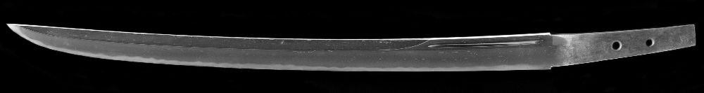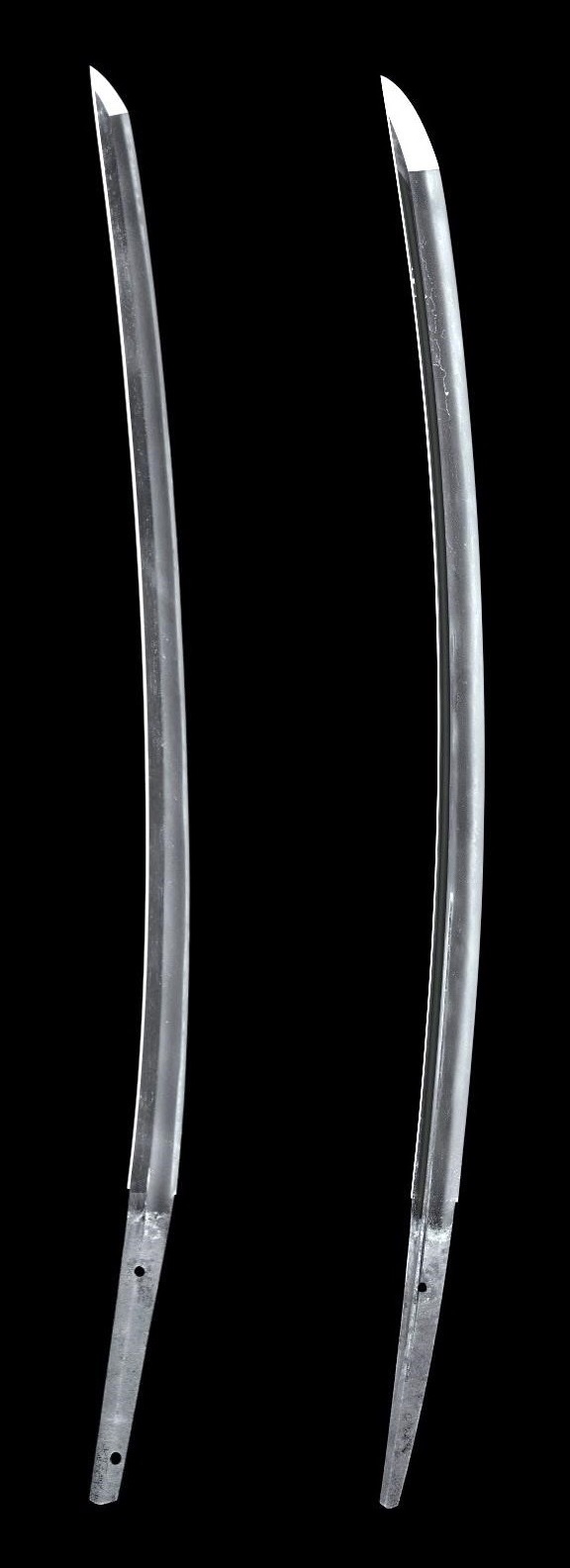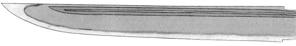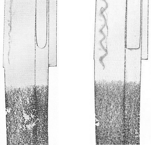 Two parallel grooves of the same thickness are called futasuji-hi (二筋樋) and appear towards the end of the Kamakura period. Thus futasuji-hi on noticeably earlier swords are probably ato-bi. Also please note that futasuji-hi were later occasionally added to blades to “underline” a certain approach. In other words, an early Nanbokuchô-style blade that showed characteristics similar to Sadamune for example could have been “enlarged” with futasuji-hi as some famous blades of this master were known for this feature. Schools and smiths known for carving futasuji-ji are: Rai Kuninaga (来国長), Nobukuni (信国), Sadamune (貞宗), Tsunahiro (綱広), Kaneuji (兼氏), the Naoe Shizu (直江志津) school, Kinjû (金重), Izumi no Kami Kanesada (和泉守兼定), Wakasa no Kami Ujifusa (若狭守氏房), the Sengo (千子) school (Muramasa [村正], Masazane [正真]), Fujishima Tomoshige (藤島友重), Inshû Kanenaga (因州兼長), for Bizen Nagamitsu (長光), Chôgi (長義), Tomomitsu (倫光), Kanemitsu (兼光), Yoshimitsu (義光), and Morikage (盛景), the Chû (中) and the Sue-Aoe (末青江) schools, Dewa no Daijô Kunimichi (出羽大掾国路), Etchû no Kami Masatoshi (越中守正俊), the Yasutsugu (康継) school, the Hôjôji (法城寺) school, Miyoshi Nagamichi (三善長道), Aizu Kanesada (兼定), Kashû Kanewaka (兼若), the Echizen-Seki (越前関) school, the Echizen-Shimosaka (越前下坂) school, the Chikuzen Nobukuni (筑前信国) school, the Fujiwara-Takada (高田) school, the Hizen Tadayoshi (忠吉) school, Mondo no Shô Masakiyo (主水正正清), Taikei Naotane (大慶直胤), Minamoto Kiyomaro (源清麿), Oku Motohira (奥元平), and Oku Mototake (奥元武).
