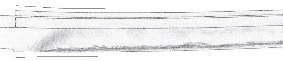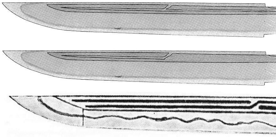 Another variant of the futasuji-hi is the shôbu-hi (菖蒲樋), that is when the tips of the two small grooves merge. Representative for adding shôbu-hi are the following schools and smiths: Rai Kunimitsu (来国光), Awataguchi Norikuni (則国), for Yamato the Taima (当麻), Hoshô (保昌), and Shikkake (尻懸) school, Sôshû Akihiro (秋広) and Hiromitsu (広光), Takagi Sadamune (高木貞宗), and the Miike (三池) school of Chikugo province. There is a variant of the shôbu-hi that comes in several interpretations and that is called kuichigai-bi (喰違樋). At one interpretation, the upper hi of a shôbu-hi, i.e. the one along the mune, is interrupted at a certain point (see picture below, top). At another interpretation, the bottom hi widens to a bôhi after the upper hi (see picture below, center). And at a third kuichigai-bi interpretation, the thin grooves are “crossing” somewhere on the blade (see picture below, bottom). In addition to those schools and smiths who applied shôbu-hi, a kuichigai-bi is also seen on blades by: Nobukuni (信国), Heianjô Nagayoshi (平安城長吉), Sanjô Yoshinori (三条吉則), the Hoshô (保昌) school, the Sue-Tegai (末手掻) school, the Kanabo (金房) school, the Sue-Mihara (末三原) school, the Uda (宇多) school, the Hiroyoshi (広賀) school, the Sue-Enjû (末延寿) school, Dewa no Daijô Kunimichi (出羽大掾国路), Etchû no Kami Masatoshi (越中守正俊), the Yasutsugu (康継) school, shintô blades from Echizen province, Taikei Naotane (大慶直胤), Kurihara Nobuhide (栗原信秀), and Gassan Sadakazu (月山貞一).