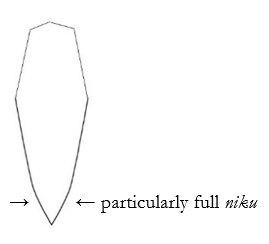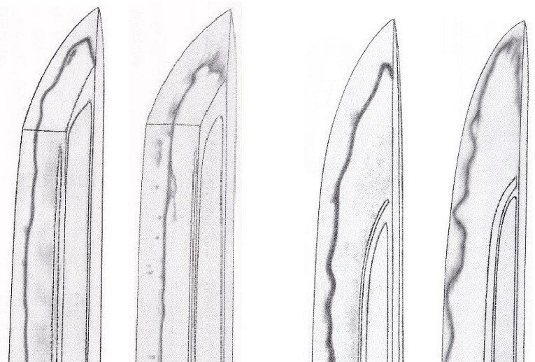 The next to check is how the hi ends towards the kissaki. There are basically two ways: Exceeding the yokote and more or less close to the ko-shinogi, a feature which is called hisaki-agaru (樋先上る), or before the yokote what is called hisaki-sagaru (樋先下る). Please note that a hisaki-agaru can be the result of a reshaped kissaki. That means the hi originally may have ended as hisaki-sagaru but due to a repair in the tip material had to be removed and the tip ends now at or towards the ko-shinogi. But when you look closely you can usually see if a hisaki-agaru ends in a straight and kind of awkward manner right at the ko-shinogi ridge (or even exceeds it a little), or if the hisaki-agaru tip leaves a chiri and runs parallel to the ko-shinogi. Hisaki-agaru is usually more often seen on kotô than on shintô blades and representative schools and smiths are: The Rai (来) school (Kuniyuki [国行], Kunitoshi [国俊], Kunimitsu [国光]), Nobukuni (信国), the Ko-Bizen (古備前) school, the Ichimonji (一文字) school, the Ko-Osafune (古長船) school (Mitsutada [光忠], Nagamitsu [長光], Kagemitsu [景光]), Kanemitsu (兼光), Kunimune (国宗), Hatakeda Moriie (畠田守家), the Ôei-Bizen (応永備前) school, Ryûmon Nobuyoshi (龍門延吉), the Enju school (延寿), Yukimitsu (行光), Horikawa Kunihiro (堀川国広), Etchû no Kami Masatoshi (越中守正俊), Echizen Yasutsugu (越前康継), Higo no Daijô Sadakuni (肥後大掾貞国), Hankei (繁慶), Teruhiro (輝広), Hizen Tadayoshi (忠吉), Suishinshi Masahide (水心子正秀), Taikei Naotane (大慶直胤), Koyama Munetsugu (固山宗次), and Kiyomaro (清麿). A noticeable hisaki-sagaru is typical for blades from the mid-Nanbokuchô period and representative schools and smiths are: The Tegai (手掻) school, the Shikkake (尻懸) school, Gô Yoshihiro (郷義弘), Tsunahiro (綱広), the Chôgi (長義) school, the Kanemitsu (兼光) school, the Motoshige (元重) school, the Aoe school (青江), the Sue-Aoe (末青江) school, the Sue-Sa (末左) school, the Sue-Seki (末関) school, Dewa no Daijô Kunimichi (出羽大掾国路), the Echizen Yasutsugu (康継) school, the Hôjôji (法城寺) school, Hizen Tadayoshi (忠吉), swords from Satsuma, and Sa Yukihide (左行秀).