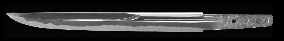 Well, also hi and horimono allow to a certain extent conclusions on the school or smith or the production time of a blade. The most common hi is that of a wide bôhi (棒樋) which was applied by so many schools and smiths and makes it impossible to quote any representative names. By the way, in the case of carved to a tantô or hira-zukuri ko-wakizashi, a wide bôhi is referred to as katana-hi (刀樋). One has to pay attention to how a bôhi was carved into a shinogi-zukuri blade. That means it can be carved directly along the shinogi or slightly set-off. This little leftover of the shinogi-ji is called chiri (チリ). Is the bôhi carved directly along the shinogi and leaves only a chiri towards the mune, we speak of kata-chiri (片チリ), and is the bôhi carved centrally on the shinogi-ji leaving a chiri along the shinogi and along the mune, we speak of ryô-chiri (両チリ). By the way, it is hardly ever seen that a bôhi extends from the shinogi to the very edge of the mune, i.e. leaving no chiri at all, or directly from the edge of the mune leaving just a chiri along the shinogi. A conspiciously wide bôhi is typical for Miike Tenta Mitsuyo (三池典太光世), Osafune Mitsutada (光忠), and Higo no Daijô Sadakuni (肥後大掾貞国), and a noticeably thin bôhi is typical for Sôshû smiths. But we can also see certain tendencies when it comes to the chiri. A kata-chiri is far more often seen on kotô blades with bôhi than on shintô blades. As this feature is so typical for kotô-bôhi, it is again hard to quote any representative names. When it comes to shintô, kata-chiri interpretations are typical for the Horikawa (堀川) school, the Hizen Tadayoshi (忠吉) school, Ogasawara Nagamune (小笠原長旨), Ippei Yasuyo (一平安代), and Yokoyama Sukesada (横山祐定), and are occasionally also seen on blades of Hankei (繁慶) and Kotetsu (虎徹). For shinshintô, we see kata-chiri preferrably at Suishinshi Masahide (水心子正秀), Taikei Naotane (大慶直胤), Oku Motohira (奥元平), Hôki no Kami Masayoshi (伯耆守正幸), and Gassan Sadakazu (月山貞一). For the kotô era, a ryô-chiri is more often seen at non-gokaden than gokaden smiths, for example at the Aoe (青江) school, the Enju (延寿) school (Kunitoki [国時], Kunimura [国村]), the Naminohira (波平) school, at Kashû Yukimitsu (加州行光), or at Kongôbyôe Moritaka (金剛兵衛盛高). Also we learn that a ryô-chiri is more often found on blades from the provinces of Kaga, Echizen, Etchû, Hôki, and Iwami, and on Sue-Niô (末二王) blades. When it comes to shintô, ryô-chiri interpretations are typical for Hankei, Ogasawara Nagamune, Sasaki Ippô (佐々木一峯), Higo no Daijô Sadakuni (肥後大掾貞国), Yamato no Daijô Masanori (大和大掾正則), and Echizen no Daijô Tadakuni (越前大掾忠国). But be careful: There is always the chance that a bôhi with ryô-chiri was later widened and became so a kata-chiri bôhi. Anyway, hi were often added later, a feature called ato-bi (後樋), so grooves are of course only indicators for kantei when they are original to the blade.