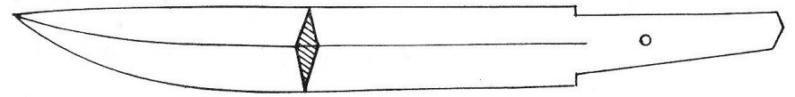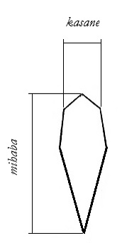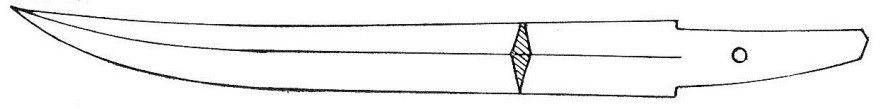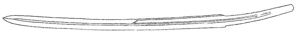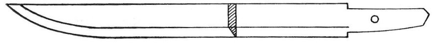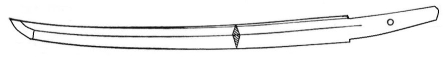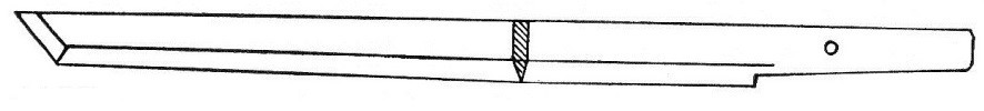 A popular combination to the koshi-bi are gomabashi (護摩箸), stylized ritual chopsticks which are basically a shorter futasuji-ji variant. Gomabashi are like koshi-bi rare for tachi and katana and mostly seen on hira-zukuri tantô or ko-wakizashi. Representative schools and smiths known for carving gomabashi are: The Awataguchi (粟田口) school (Kuniyoshi [国吉], Yoshimitsu [吉光]), the Rai (来) school (Rai Kunitoshi [来国俊], Kunimitsu [国光]), Nobukuni (信国), the Hasebe (長谷部) school, Heianjô Nagayoshi (平安城長吉), Sanjô Yoshinori (三条吉則), Shintôgo Kunimitsu (新藤五国光), the Masamune (正宗) school (Yukimitsu [行光], Sadamune [貞宗]), Kagemitsu (景光), the Ôei-Bizen (応永備前) school, the Sue-Bizen (末備前) school, Izumi no Kami Kanesada (和泉守兼定), Shimada Yoshisuke (島田義助), the Horikawa (堀川) school, Hizen Tadayoshi (忠吉), shintô swords from Echizen province, Suishinshi Masahide (水心子正秀), and Taikei Naotane (大慶直胤). Please note that Yamashiro smiths often combined the gomabashi with a suken on the other, i.e. the omote side. Apart from that it has to be mentioned that the Awataguchi smiths carved their katana-hi closer to the mune than the Rai smiths when it comes to grooves on Kamakura-period Yamashiro tantô.