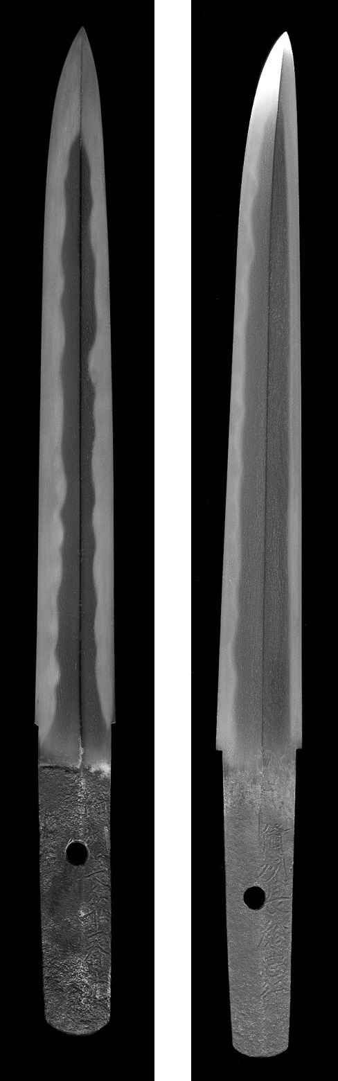Also we must not forget that up to the mid-Nanbokuchô period there were some smiths who worked in two blade shapes, that is to say on the one hand in a tachi-sugata that followed the style of their times, and on the other hand in a classical slender tachi-sugata which remind of the late Heian or early Kamakura period. Representative for these “reminiscence of classic tachi-sugata” were Rai Kunitoshi (来国俊), Rai Kunimitsu (来国光), Ryôkai (了戒), for the Osafune school Nagamitsu (長光), Kagemitsu (景光), Sanenaga (真長), and the 1st generation Kanemitsu (兼光), Kanro Toshinaga (甘呂俊長), and certain Enju smiths like Kunimura (国村) or Kunitomo (国友).