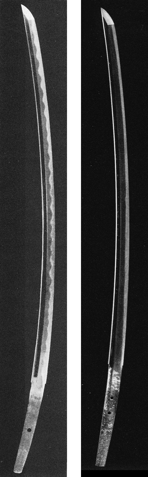 Representative schools and smiths for a late Kamakura to early Nanbokuchô period sugata are: Kyô-mono like the Rai (来) school (Kunimitsu [国光], Kunitsugu [国次], Mitsunake [光包], Ryôkai [了戒]); the Senju´in (千手院) school (Yoshihiro [義弘]), the Shikkake (尻懸) school (Norinaga [則長], Norihiro [則弘]); the Taima (当麻) school (Kuniyuki [国行], Kunikiyo [国清], Chô Aritoshi [長有俊]); the Hoshô (保昌) school (Sadamune [貞宗], Sadayoshi [貞吉]); the Tegai (手掻) school (Kanenaga [包永]); for the Sôshû tradition (Masamune [正宗], Yukimitsu [行光], Sadamune [貞宗], Shizu Saburô Kaneuji [志津三郎兼氏], Kinjû [金重], Gô Yoshihiro [郷義弘], Norishige [則重]); the Yoshioka-Ichimonji (吉岡一文字) school (Sukeyoshi [助吉], Sukemitsu [助光], Sukeyoshi [助義], Sukeshige [助茂]); the Iwato or Shôchû-Ichimonji (岩戸・正中一文字) school (Yoshiuji [吉氏], Yoshimori [吉守]); the Osafune school (Kagemitsu [景光], Chikakage [近景], 1st generation Kanemitsu [兼光]); the Hatakeda (畠田) school (Sanemori [真守], Morishige [守重]); the Un (雲類) group (Unshô [雲生], Unji [雲次]); other Bizen smiths like Kokubunji Sukekuni (国分寺助国) or Wake no Shô Shigesuke (和気庄重助); the Chû-Aoe school (Yoshitsugu [吉次], Tsuguyoshi [次吉], Nobutsugu [信次], Naotsugu [直次], Hidetsugu [秀次]); the Katayama-Ichimonji school (Sanetoshi [真利], Tsugunao [次直], Chikatsugu [近次]); and for Kyûshû for example Jitsu´a (実阿), Ô-Sa (大左), Sa Kunihiro (左国弘), the Enju (延寿) school (Kunisuke [国資], Kuninobu [国信], Kunitoki [国時], Kuniyoshi [国吉], Kuniyasu [国泰]), or for the Naminohira school Yasumitsu (安光).