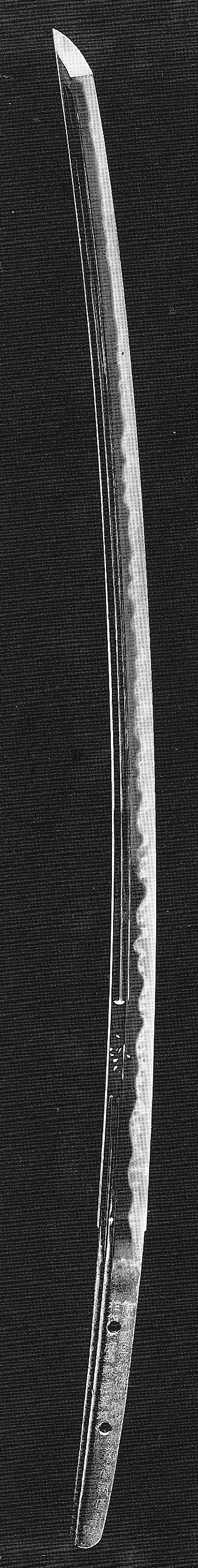 Tachi continuously increase in size and length towards the end of the Kamakura and early Nanbokuchô period but what is now most conspicious is the increase in kissaki size and the giving-up of the koshizori in favor of a toriizori. Apart from that, the kasane starts to get thinner and the abundance of niku disappears again. Tachi-sugata from that time are large and magnificent but yet not exaggerated or strikingly oversized.