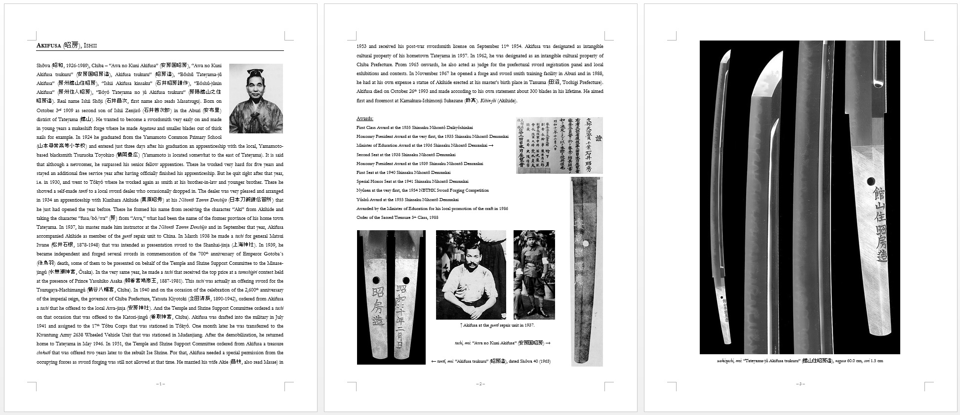 I don’t have any information on the jûyô-bijutsuhin so I want to focus on the tokubetsu-jûyô of which the second character is illegible but which is otherwise ubu. Please note that the NBTHK is, as often in such high spheres, careful and gives an attribution to Gojô as there also other Gojô artists active whose names start with “Kane,” e.g. Kanetsugu (兼次) and Kaneyasu (兼安). Well, these smiths quasi only exist on paper as no signed blades are extant by them, but it is true, you just can’t make a straightforward Kanenaga attribution if you are not entirely sure. So the tokubetsu-jûyô (picture 3) also has an elegant sugata with a strong koshizori, funbari, and a ko-kissaki. The jigane is an itame with ji-nie and a faint nie-utsuri. The hamon shows this time not so many chôji. It is a suguha-chô in ko-nie-deki that is mixed with ko-chôji, ko-midare, and plenty of ashi and yô. The nioiguchi is rather tight but tends to be dull along the monouchi. The bôshi is sugu with a short ko-maru-kaeri.