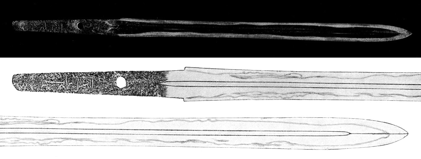 Category two of the known Kuninaga-mei contains two blades, a tachi that is preserved in the Ise Shrine and a jûyô-bunkazai ken (see picture 5) that was once owned by the tôsôgu expert Kokubo Ken’ichi. Unfortunately, I have no picture of the Ise Shrine blade but want to assume for the time being that the workmanship is similar to that of the ken as also the mei is very similar. My assumption bases on the following two factors: One is the statement of Honma sensei who was of the opinion that the Ise Shrine tachi is the oldest extant signed work of Kuninaga. And the other factor is that we can see a lot of the very classical, “naturally layered” approach of the ha at the ken. This feature can also be seen on the works of Sanjô Munechika what supports an earlier production time. The Ise Shrine tachi is slender and shows a koshizori and a ko-kissaki The kitae is itame that is mixed with ô-hada in places and the hamon is a nie-laden hiro-suguha-chô that is mixed with ko-midare and ko-chôji that comes with a more subdued nioiguchi. The ken shows a noticeable amount of masame along the kitae what makes it kind of yamatoesque. This and the fact that it is, well, an old ken, might add to the subjective “old feel” of the blade and Tanobe sensei assumes that ken had always been forged in a more classical way because making them had a strong religious and ceremonial character and did not leave much artistic freedom or room for trying something new. Apart from that, Tanobe also assumes that the subdued nioiguchi and thus more ancient feeling hamon of the Ise Shrine tachi goes back to a loss of hira-niku and that the hamon might once had been similar to that of the Tsurumaru. And Tsuneishi Hideaki (常石英明), the author of the Nihontô no Kenkyû to Kantei and Nihontô no Kantei to Kansho, even assumes that mei of category two go back to a third generation Kuninaga. Tsuneishi also says that the Tsurumaru-mei dates to the later years of a the first generation Kuninaga.