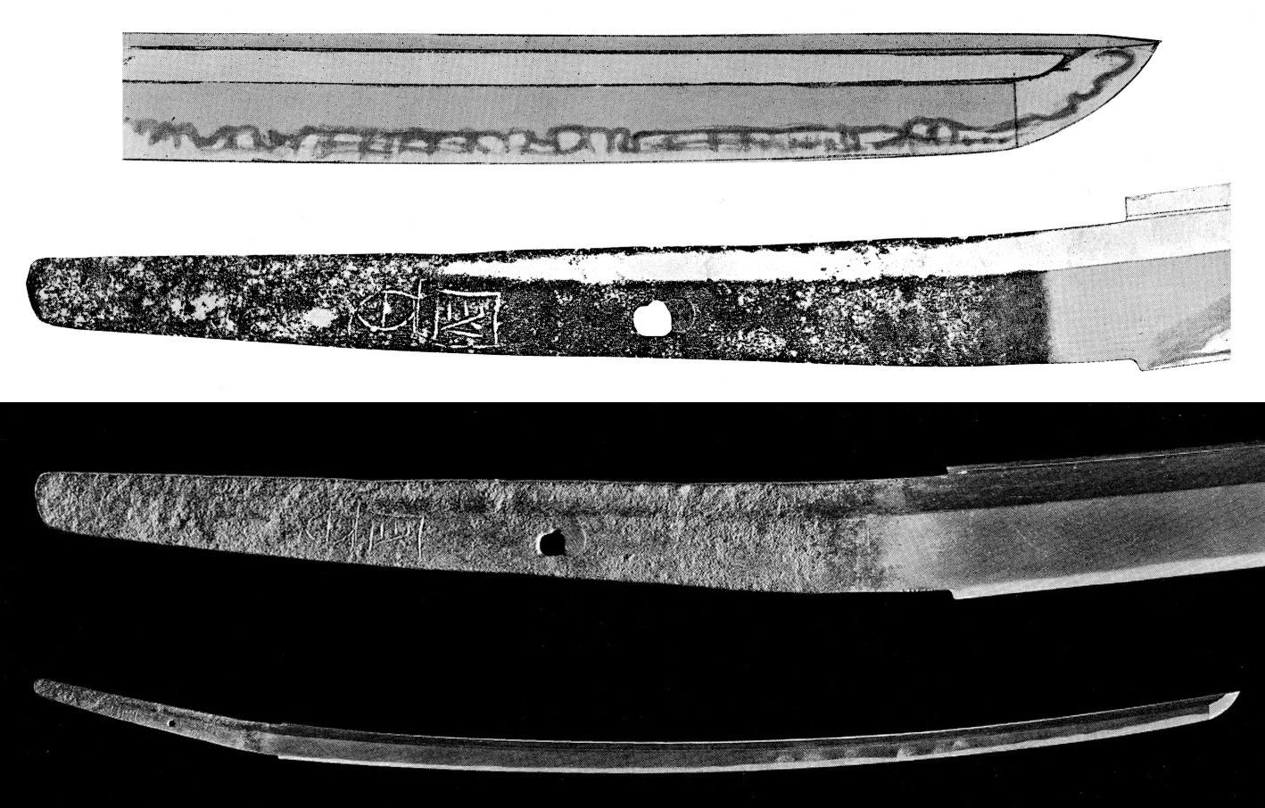 A blade that is close to the Onimaru in terms of workmanship and mei (although the tang has suffered somewhat in that area) is the tokubetsu-jûyô shown in picture 5. The blade is a little tired and lost some substance towards the tip but is otherwise outstanding. The kitae is a somewhat standing-out itame with nagare and ô-hada along the omote side and shows ji-nie and a faint nie-utsuri. The hamon is a ko-nie-laden suguha-based ko-chôji mixed with some gunome, ko-midare, ashi, yô, and sunagashi and kinsuji along the lower half. The bôshi is sugu and has a ko-maru-kaeri. The nie-utsuri forms a kind of mizukage-like appearance at the base, that means we see a certain approach in hardening that Kunitsuna’s later blades seem to have in common. The sword was once a heirloom of the Nishitakatsuji (西高辻) family that served on a hereditary basis as shintô priests the Dazaifu Tenmangû on Kyûshû.