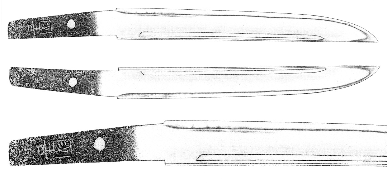 Tantô make the majority of Awataguchi Kuniyoshi’s extant oeuvre. There is one jûyô-bunkazai, a couple of jûyô-bijutsujin, and more than a dozen jûyô/tokubetsu-jûyô tantô, and the majority of these tantô is signed (all but one in niji-mei, the one “exception” is signed “Saemon no Jô Kuniyoshi”). When we take a look at all these tantô we learn that he interpreted them in a great variety of shapes. There are such with a standard, a mid-sized and elegant Kamakura-period sugata, smaller and wider tantô that tend to a hôchô-sugata, long and thin tantô, and long and wide tantô that come in a sunnobi-sugata. His tantô show a little uchizori or no sori at all and can come with an iori or a mitsu-mune. Also we see several kinds of grooves like gomabashi, katana-hi, katana-hi with tsurebi, combination of suken on the one and koshibi on the other side, combination of katana-hi with bonji on the hira-ji towards the base, bonji and suken as relief in a katana-hi, and futasuji-hi on both sides. As mentioned, the hi are engraved in Awataguchi-manner quite close to the mune and some end in Kuniyoshi’s peculiar diagonal manner. And before I introduce some of his tantô I briefly want to address Kuniyoshi’s standing within his school. Some see him as best tantô smith of all times whereas this attribute is mostly associated with his successor Yoshimitsu. Others say he was the best when it comes to a gentle and dignified suguha whilst Honma sensei ranks him second in his school in terms of skill, only surpassed by Hisakuni. Well, works of these Awataguchi masters are all outstanding and the quality is so close that such rankings are more of a subjective nature and not really something to fight about.