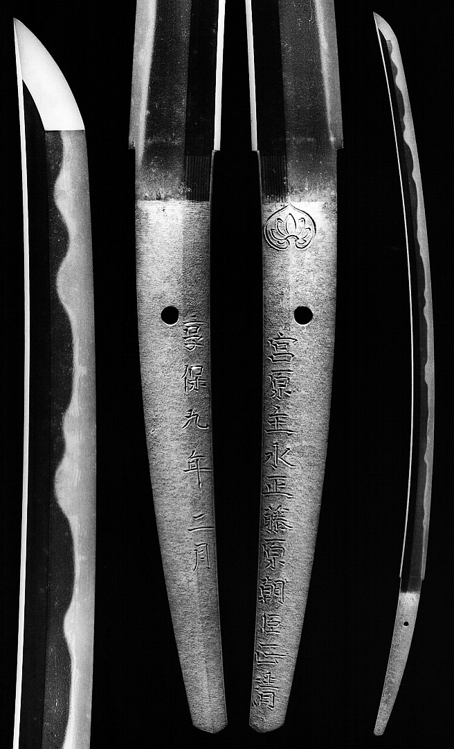 The signed jûyô-bunkazai (see picture 2) was shortened up to the signature but retains its elegant sugata that is again not that much tapering and ends in a chû-kissaki. The interpretation of the jiba is very similar to the tokubetsu-jûyô and we see the same prominent and discontinuous nijûba that focuses on the upper part of the blade and that continues into the bôshi, here even a hint more pronounced. Incidentally, this feature has already been pointed out in pre-Edo period sword publications.