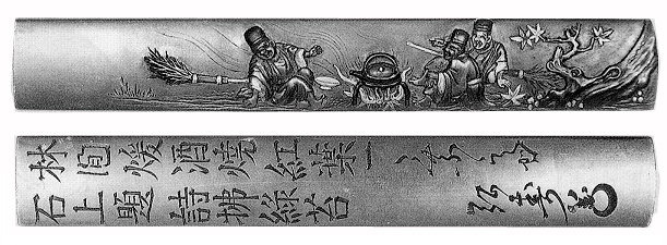 To demonstrate what discrepancies we are facing with the “to mei ga aru” works, or rather to demonstrate the lack of discrepancies, I want to introduce in picture 4 one such blade, the one whose mei is shown in picture 3 on the bottom left. It even passed tokubetsu-jûyô, that means if the mei (and workmanship) was that off, it would not have received jûyô (or even hozon) in the first place. In other words, if the mei was judged as gimei (or way too off), the blade would not have passed any paper and be returned to the owner who might then be left with the decision having the signature removed and submitting it again (most likely then it would actually receive a paper on Awataguchi, or even on Awataguchi Kuniyoshi). So these to mei ga aru signatures can make it up to the tokubetsu-jûyô rank without problem and the supplement in question has to be understood as “precaution” on the part of the NBTHK. Take a look at the blade in picture 4 and judge yourself. It is a slender tachi with a deep koshizori and a chû-kissaki, showing a very dense ko-itame mixed with some mokume and nagare that features plenty of ji-nie, chikei, a hint of jifu, and a faint nie-utsuri. The hamon is a ko-nie-laden chû-suguha-chô mixed with ko-chôji, ko-gunome, plenty of ashi and yô, fine sunagashi, kinsuji, and the very same prominent discontinuous nijûba that also runs into the bôshi. The nioiguchi is wide and bright and the bôshi is sugu with a ko-maru-kaeri. The condition of this blade is outstanding. It was once owned by the statesman Ôkubo Ichiô (大久保一翁, 1818-1888) and went then into the possession of the Iwasaki family (岩崎).