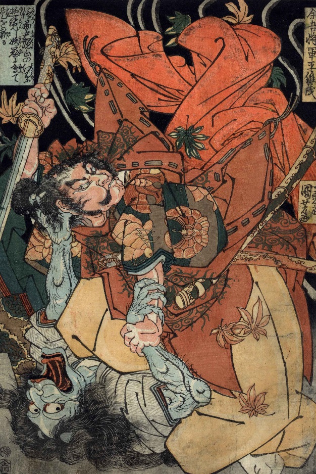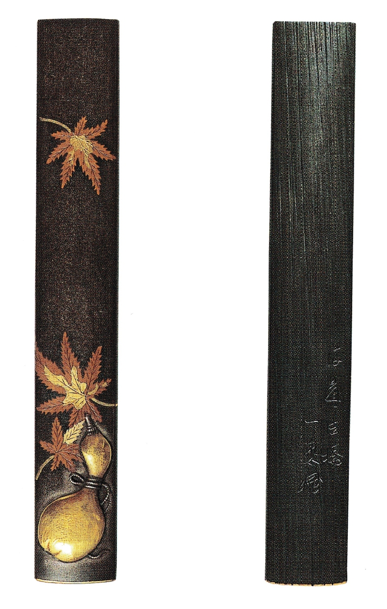 And last but not least I want to introduce another tantô of Kuniyoshi, a jûyô-bijutsuhin, that shows the diagonal ending of his hi that I have mentioned several times. This tantô – which was an heirloom of the Aoyama family (青山), the daimyô of the Sasayama fief (篠山藩) of Tanba province by the way – is with a nagasa of just 20.4 cm pretty short and tends with the wide mihaba to a hôchô-sugata. The jigane is a dense ko-itame with plenty of fine ji-nie and nie-utsuri and the hamon is a chû-suguha in ko-nie-deki that is mixed with ko-ashi and yô and that thins somewhat down towards the fukura. Please note the ko-ashi at the base which make the hamon there tend a little bit to ko-gunome. This feature anticipates a typical characteritic of Kuniyoshi’s successor Yoshimitsu (which will be addressed in detail in the next chapter) and that is why I am introducing this tantô here. Also we see nijûba, although here just at the base, and some hakikake along the relative wide ko-maru-kaeri.