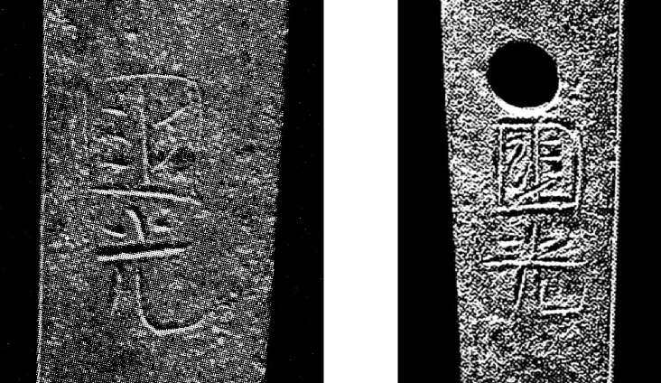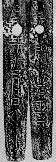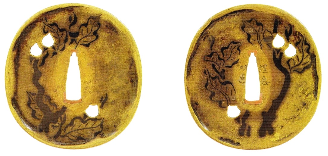 When it comes to Yoshimitsu’s signatures, we basically distinguish between two groups: A more “stiff” and “angular” one that is executed with a somewhat thicker chisel, and a “looser” and more “roundish” one for which a thinner chisel was used. The former features a smaller lower kuchi (口) radical of the character for Yoshi (吉) and is therefore also referred to as koguchi-mei (小口銘), and the latter, with the noticeably larger kuchi radical, as ôguchi-mei (大口銘) respectively. It is assumed that the ôguchi group goes back to his late years. Tanobe sensei introduces a third group which is somewhere in between these two and that mixes certain elements from each group, i.e. that goes back to a transitional time if you want, which he personally thinks of being the most elegant one. Picture 1 below shows one exemplary mei for each group.