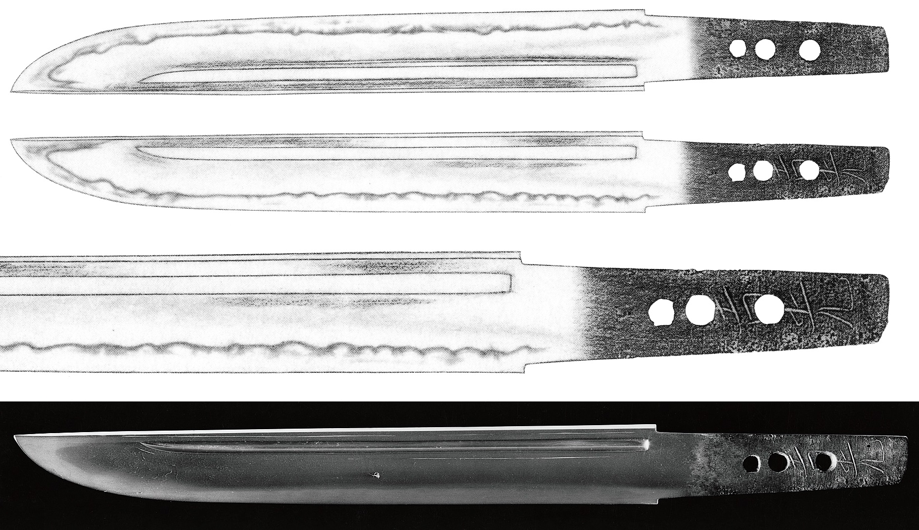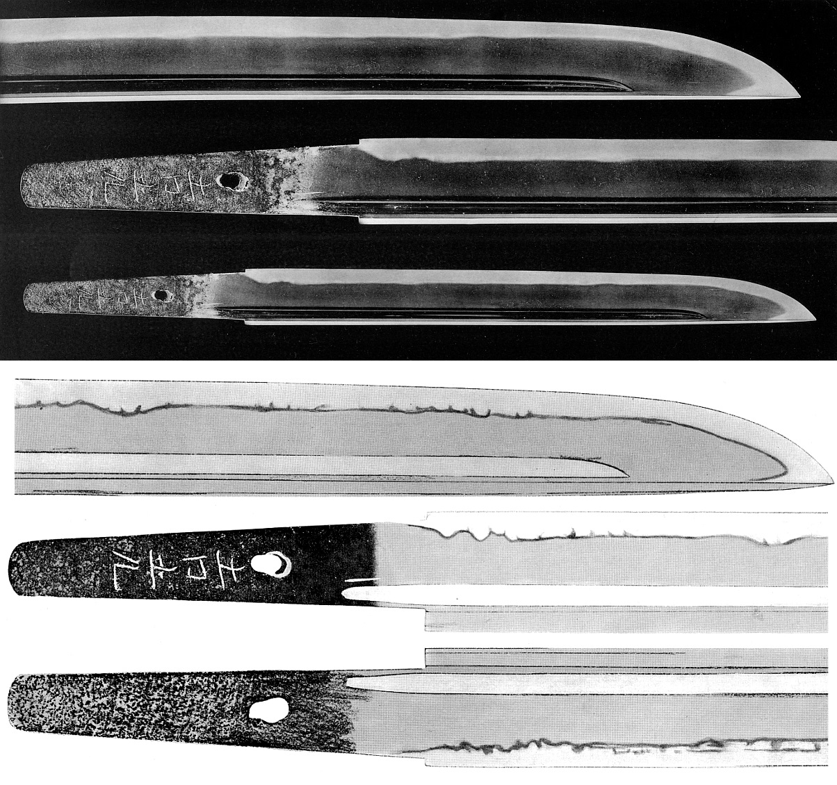 And before we go over to the tantô, let me introduce one more of these “other” blades of Yoshimitsu, the meibutsu Honemabi-Tôshirô (骨喰藤四郎, lit. “bone-gnawing Tôshirô”), which is a mumei naginata-naoshi that is designated as jûyô-bunkazai, despite the fact that it is saiha (retempered by the 3rd gen. Yasutsugu after the Great Meireki Fire). In old oshigata collections we see a slanting ko-midare/chôji mix at the base which turns into a calm suguha-chô with ko-ashi. The blade shows prominent horimono of a kurikara and Fudô-Myôô with atop a bonji in a hitsu recess. On the basis of the tang it is speculated that the blade had been mumei from the beginning, that means, even if the naginata – it was once a smaller-sized ko-naginata – was shortened to wakizashi/uchigatana length, the signature would have been at a higher position anyway and would not have been affected by the shortening. The attribution to Awataguchi Yoshimitsu goes back to the Hon’ami family and the jûyô-bunkazai designation – which says “Den” Awataguchi Yoshimitsu by the way – reflects more the historical value and provenance of the blade, which is as mentioned shortened, unsigned, and saiha.