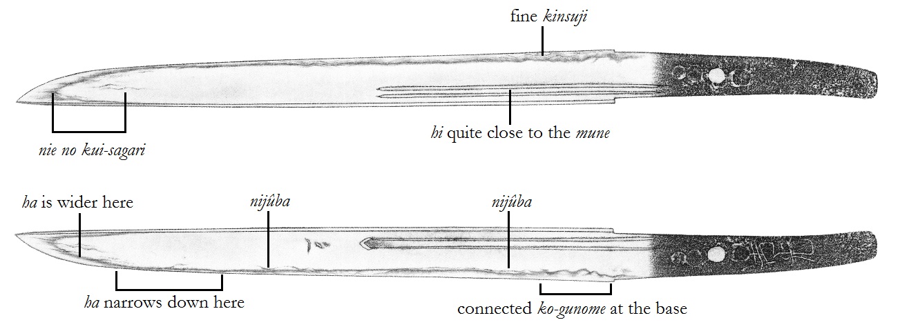 Now to Yoshimitsu’s tantô. Many experts see him as best tantô smiths of all times, standing on top of the winners’ rostrum with Shintôgo Kunimitsu. On top of that, he is counted with Masamune and Gô Yoshihiro to the so-called sansaku (三作), a term that was coined in the Edo period and which means about “Best Three Smiths of All Times.” With 16 listed blade, he also ranks, from a quantitative point of view, number three in the Kyôhô Meibutsu Chô, only “beaten” by Masamune with 39, and Sadamune with 19 blades. Incidentally, 18 blades of him are found in the yakemi section of the Kyôhô Meibutsu Chô. As comparison, the publication lists the same number of yakemi by Masamune and eleven of Gô Yoshihiro. When we get a quick overview of Yoshimitsu’s tantô, we learn that things are not that much different than with Kuniyoshi. That is, he made tantô in a great variety of shapes, e.g. standard ones, smaller and wider hôchô-style blades, long and thin, and long and wide tantô which feature a sunnobi-sugata. Also the way grooves are added is very similar to Kuniyoshi and when we remember that Kuniyoshi worked up to Kôan (弘安, 1278-1288) and Yoshimitsu is traditionally dated around Kôan and the subsequent Shôô era (正応, 1288-1293), we realize that this dating is – despite of the fact that as mentioned no date signatures of Yoshimitsu are extant – quite senstive. In other words, the interpretation of extant works corroberates that Yoshimitsu’s active period has been pretty close to that of Kuniyoshi what allows us to speculate that he indeed might has been his younger brother rather than his son as for a son, we would expect a hint later nengô like for example Einin (永仁, 1293-1299) or Shôan (正安, 1299-1302), which in turn means leaving late Kamakura and entering the final years of this period. Anyway, regardless of the sugata of tantô, we see characteristic features that appear on the majority of blades from that category and which can be described as follows: Small connected gunome elements or at least gunome-ashi at the yakidashi which make that area look like small strung together beans. Sometimes also an approach or even a solid koshiba might be seen. Nijûba or nijûba-like yubashiri appear parallel to the habuchi, but not as obvious and not all over the blade it is the case at Kuniyoshi. The ha often gets somewhat wider, and/or thins a little out before it enters the bôshi. This feature can be pretty obvious and appear as a true bend, or might just as a bend by a slightly thinnig or slightly widening ha at the point where the bôshi starts. In addition, the nie are much more emphasized in the bôshi and appear there often as if they “spill” in a frayed manner into the ji, a feature that is referred to as nie no kui-sagari (沸の喰い下がり). Please note that there is some confusion with the term okina no hige (翁の髭, lit. “beard of an old man”). This term too refers to increasing nie in the bôshi but is reserved for Shintôgo Kunimitsu. Basic difference is that okina no hige are super fine kinsuji within the ha that remind – due to the fact that they follow the underlying hada which tends at Shintôgo somewhat to nagare in that area – of the long beard of an old man. They might reach into the ji too in certain cases but focus as mentioned more on the ha whereas at Awataguchi Yoshimitsu, the nie-hataraki take much more place in the ji than in the ha. So before we continue, let me summarize the characteristic feature of Yoshimitsu in picture 6 below.