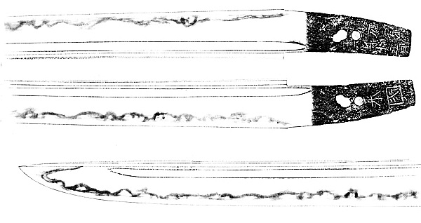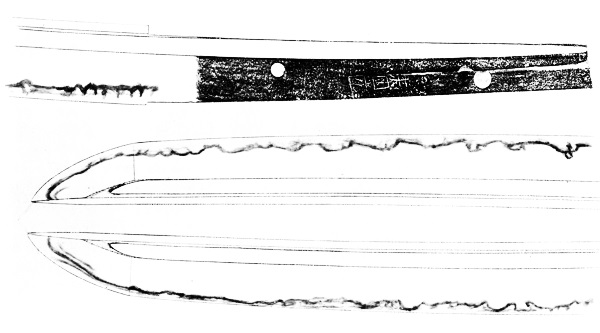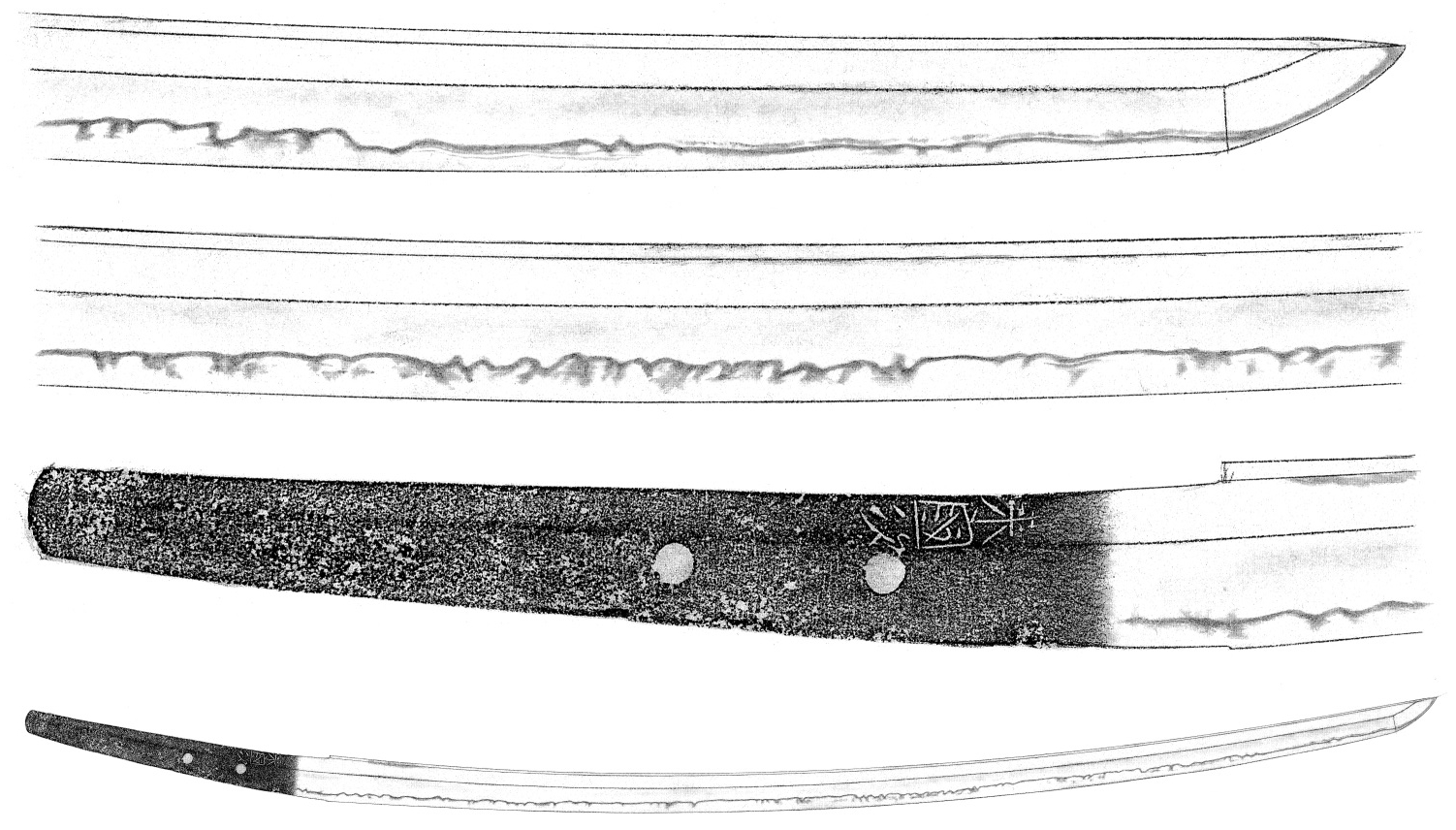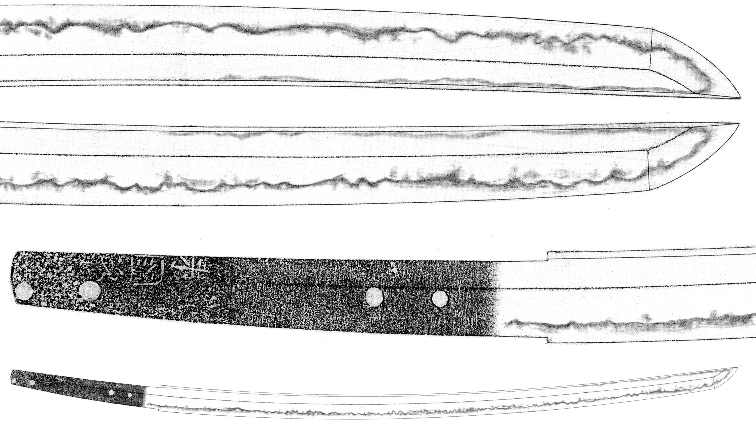 And last but not least one of the very few long swords that I was able to find which might well be a work of the second generation. It is a tachi bearing an orikaeshi-mei that was once an ôdachi measuring somewhere around 90 cm. It was shortened to 71.4 cm, has a rather wide mihaba, despite the suriage a relative deep sori, and an elongated chû-kissaki. The kitae is a standing-out itame mixed with some nagare and ji-nie appears. The hamon is a shallow ko-notare in ko-nie-deki that is mixed with ko-midare, gunome, ko-chôji, plenty of ko-ashi, sunagashi and kinsuji. The bôshi is a shallow notare-komi with a very brief ko-maru-kaeri and features nijûba. So probably the distinct midareba in combination with the somewhat inferior kitae and the smallish mei are the most important features for attributing this blade to the second generation.