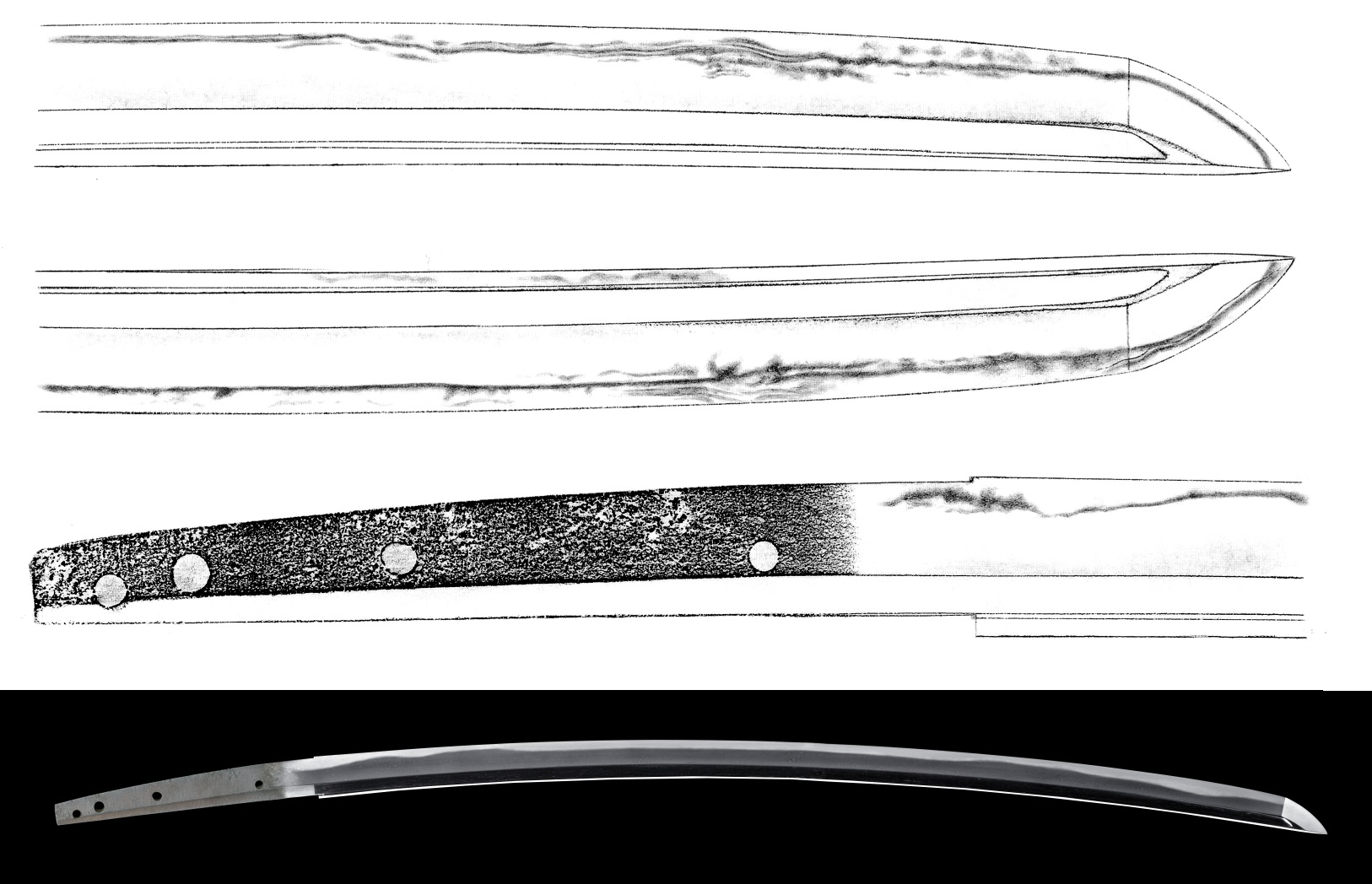 Picture 3: tokubetsu-jûyô, katana, mumei “Rai Kunimitsu” (来国光), nagasa 73.6 cm, sori 1.6 cm, motohaba 3.1 cm, shinogi-zukuri, iori-mune