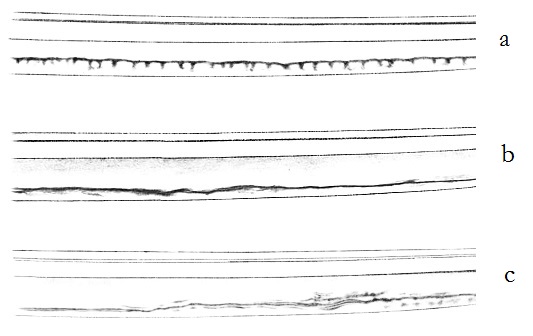 Before we continue with Rai Kunimitsu’s tantô, let me first repeat his three basic long sword styles and second, address the sensitive point of Rai-hada. One of his basic styles is the suguha-chô that is mixed with ko-chôji and ko-gunome or rather with chôji-ashi or gunome-ashi (picture 5 a). The other basic style is an almost pure suguha with just some ashi or slanting Kyô-saka-ashi and a little nijûba and/or kuichigaiba (picture 5 b). And the third one is an undulating suguha that shows horizontal, layered, “yamatoesque” hataraki (that remind if you want a little bit of Rai Kuniyuki) (picture 5 c).