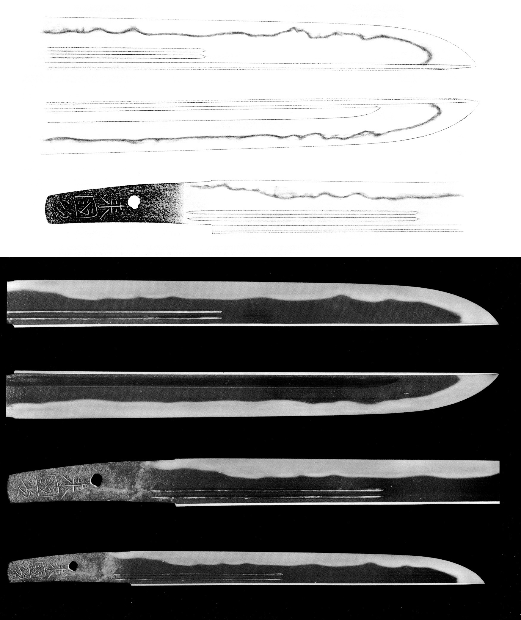 As you can see in the oshigata to blade 1, the hamon is truly interpreted as suguha-chô, i.e. running straight but mixed with an abundance of ko-chôji and ko-gunome or rather with chôji-ashi and gunome-ashi for most of the time. But Rai Kunimitsu also worked in pure suguha, or to be more precise, in a somewhat undulating suguha, i.e. not in a perfectly straight suguha as for example seen on a Hizen blade. The blade shown in picture 3 is a good example for this field of his repertoire and I picked it not only because I had the opportunity to study it hands on but because it it shows two important characteristic features of Rai Kunimitsu, and that is isolated sections of njûba and brief kuichiga-ba. And not to forget, it also shows a feature that distinguishes him from Rai Kunitoshi, namely that his ha comes with a somewhat tighter and more “defined/precise” habuchi. The blade has a magnificent and wide sugata that so to speak anticipates the later grandeur from the heyday of the Nanbokuchô era and the kitae is this time a somewhat standing-out itame that is mixed with mokume and that is not as tightly forged as at the two kokuhô. It also shows plenty of ji-nie and a nie-utsuri. The hamon is as mentioned a suguha in ko-nie-deki that tends overall a little to notare and is mixed with ko-ashi and some nijûba towards the yokote. The bôshi is sugu with a ko-maru-kaeri and kuichigai-ba and both sides bear the so to speak “obligatory” Rai Kunimitsu bôhi that runs due to the ô-suriage as kaki-tôshi through the tang. Incidentally, the blade was once a heirloom of the Owari-Tokugawa family and Hon’ami Kôchû issued (in Genroku three, 1690) an origami for it, giving it a value of 500 kan.