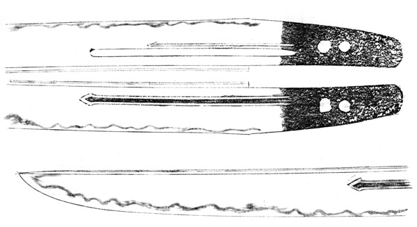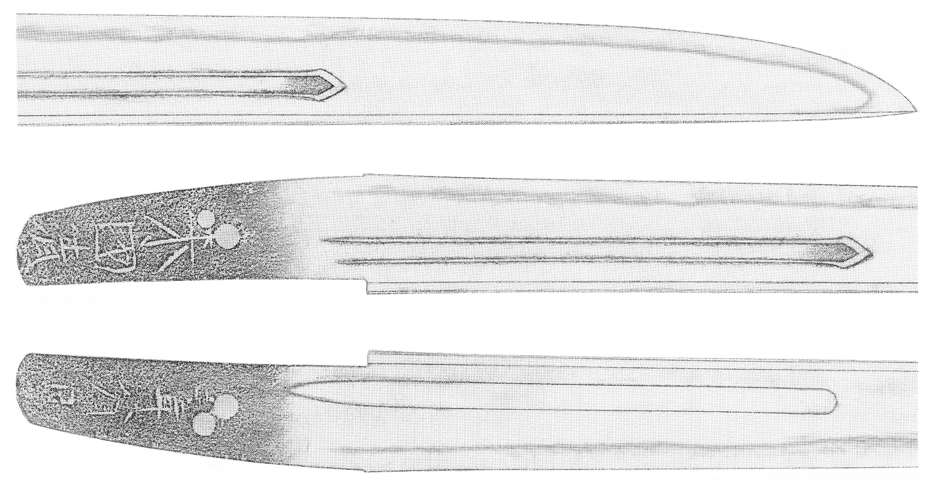 To conclude this chapter, I want to introduce the smith Rai Mitsushige (来光重) who is dated around Gentoku (元徳, 1329-1331) and who was a student of Rai Kunitoshi. Well, some speculate that Mitsushige was the early name of Rai Kunimitsu but the signature style differs too much as to follow this approach blindly. However, signed works of him are extremely rare so well, we can’t say for sure if there is some truth in this tradition. I for my self see them as two individual smiths for the time being. Now there is one signed tantô extant (see picture 7) that is also dated, namely “Gentoku sannen jûgatsu nijûninichi” (元徳三年十月廿二日, “22nd day of the tenth month Gentoku three [1331]”). It is rather wide, has a little uchizori, and comes in a sunnobi-sugata. The kitae is a ko-itame with nagare and ji-nie and the hamon is a suguha in ko-nie-deki that shows nijûba along the monouchi. The bôshi narrows very much down along the fukura and runs widely back as ko-maru-kaeri. On the omote side we see a suken and on the ura a take-kurabe-style koshibi with soebi. The tang is ubu, has a kurijiri, shallow katte-sagari yasurime, and bears a rather largely chiseled mei.