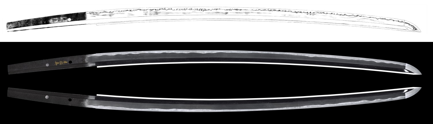 Picture 1: jûyô, tachi, mei “Kunihide” (国秀), nagasa 71.5 cm, sori 1.6 cm, motohaba 2.95 cm, sakihaba 2.35 cm, shinogi-zukuri, iori-mune