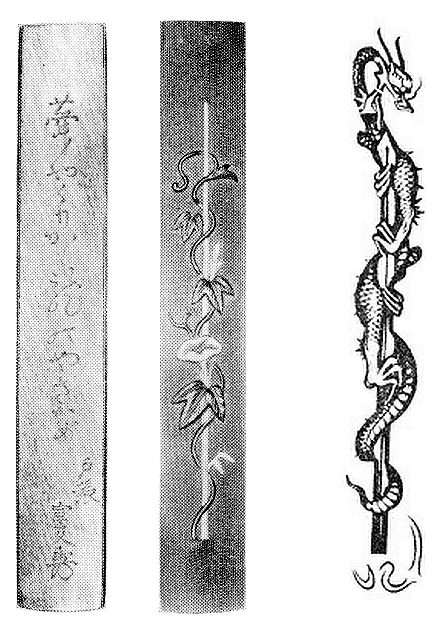 Before we continue, I want to introduce one of these morning glory kozuka. There are several going round, so he must have made a bunch of them and as even the Kinkô Tanki mentions this very interpretation, it must have been much celebrated amongst his customers. Side note: Tomihisa’s works are all top-notch, i.e. he was truly highly skilled. To the right of the kozuka, a kurikara-ryû engraving as we know if from swords, i.e. what came to Tomihisa’s mind when he looked at morning glories. On the other hand, a kurikara-ryû was an in-house kozuka motif of the Gotô School and maybe Tomihisa got his inspiration from preparing such pieces for the Gotô and thought to himself one day, let’s convert that into a morning glory.