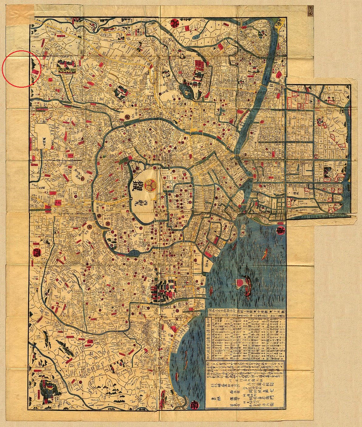 Taking another lead from the relevant sources, that is that Tomihisa also ran a soba noodle restaurant, our journey continues. Digging into that soba matter I learned that Tomihisa did not just open a noodle restaurant because he “felt like to,” no, I found out that he was actually the fourth generation of a successful soba business that was located, get this, in Zôshigaya. From here, we have to take a detour to Edo period soba culture as it is in my opinion essential for the understanding of the whole career of Tomihisa. It is thought that soba noodles were introduced around the beginning of the Edo period and the first real soba shop or restaurant was opened, in Edo, during the Kanbun era (寛文, 1661-1673). Later on, Edo had everything from small and ultra-portable soba stands to large-scale restaurants that offered seating for many dozens of customers. Zôshigaya was a little special. The area started as a small village of the same name located about 3.5 miles to the northwest of downtown Edo. There was some much frequented temple and falconry grounds of the bakufu out there and after the Great Fire of Meireki had destroyed much of Edo in 1657, several bushi decided to rebuild their residences in the suburbs. As a result, the village of Zôshigaya gradually developed into an Edo outskirt and by the mid-1800s, it was officially acknowledged as a district (machi/chô, 町) of Edo. But it was still quite rural and woody and it even hardly made it onto the much later, the famous Kôka era (弘化, 1844-1848) map of Edo that is shown below (the circle marks Zôshigaya).