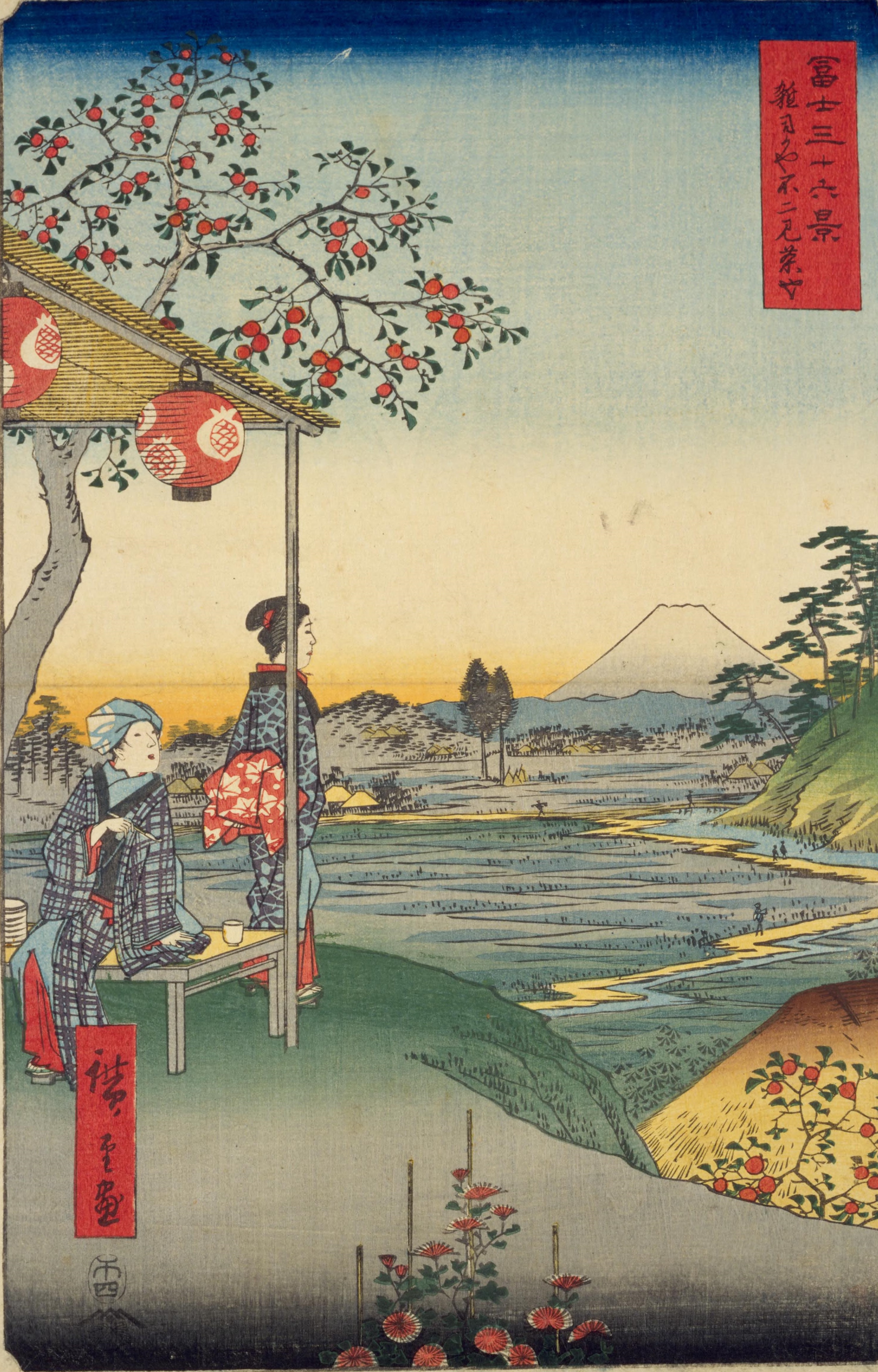 Below I want to present two ukiyoe prints by Utagawa Hiroshige (歌川広重, 1797-1858) where he features Zôshigaya. On the one hand as a reference, i.e. to show you the atmosphere of the then Zôshigaya neighborhood, but on the other also because the bottom one that has a view of Mt. Fuji shows at the very bottom, lo and behold, morning glories! So these flowers were around where Tomihisa ran his soba restaurant. With this in mind, I think that he was kind of inspired by them, maybe they reminded him of his time as an apprentice with the Gotô family (more on this in a little), i.e. preparing and handling kozuka with kurikara-ryû motifs, and so he combined all that, that is his inspiration, the fact that he was involved in the kinkô craft, and his poetry, asked then his friend Hôitsu for a sketch for a morning glory on a pole, and turned all that into a nice little kozuka series. But you have to understand, asking Hôitsu for a sketch does not mean that Tomihisa was incapable of drawing one himself. No, such collaborations were very common and a vehicle to honor all involved artists and craftsmen.